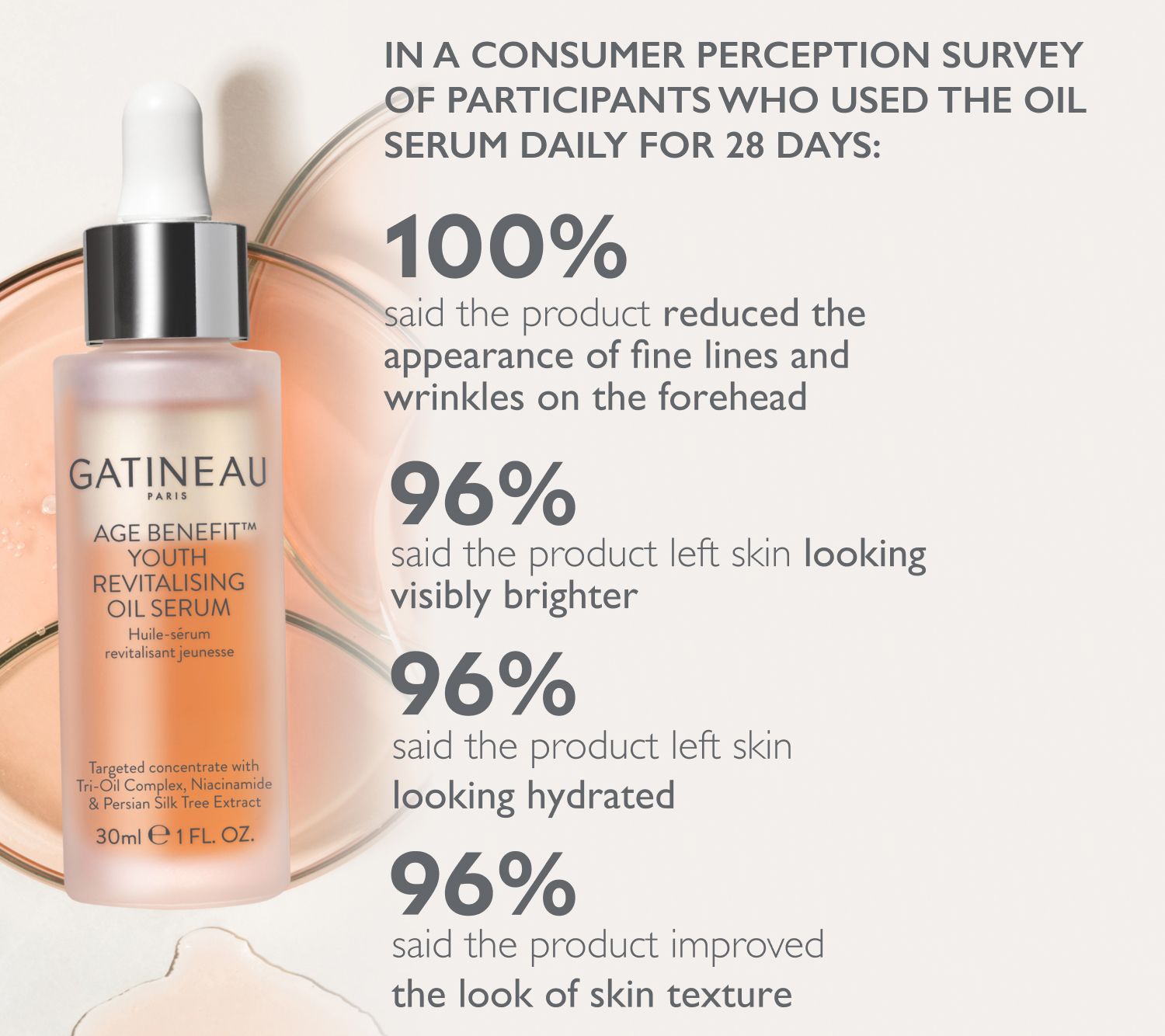 In a consumer perception survey of participants who used the oil serum daily for 28 days: -- 100% said the product reduced the appearance of fine lines and wrinkles on the forehead -- 96% said the product left the skin looking visibly brighter -- 96% said the product left the skin looking moisturized and healthier looking