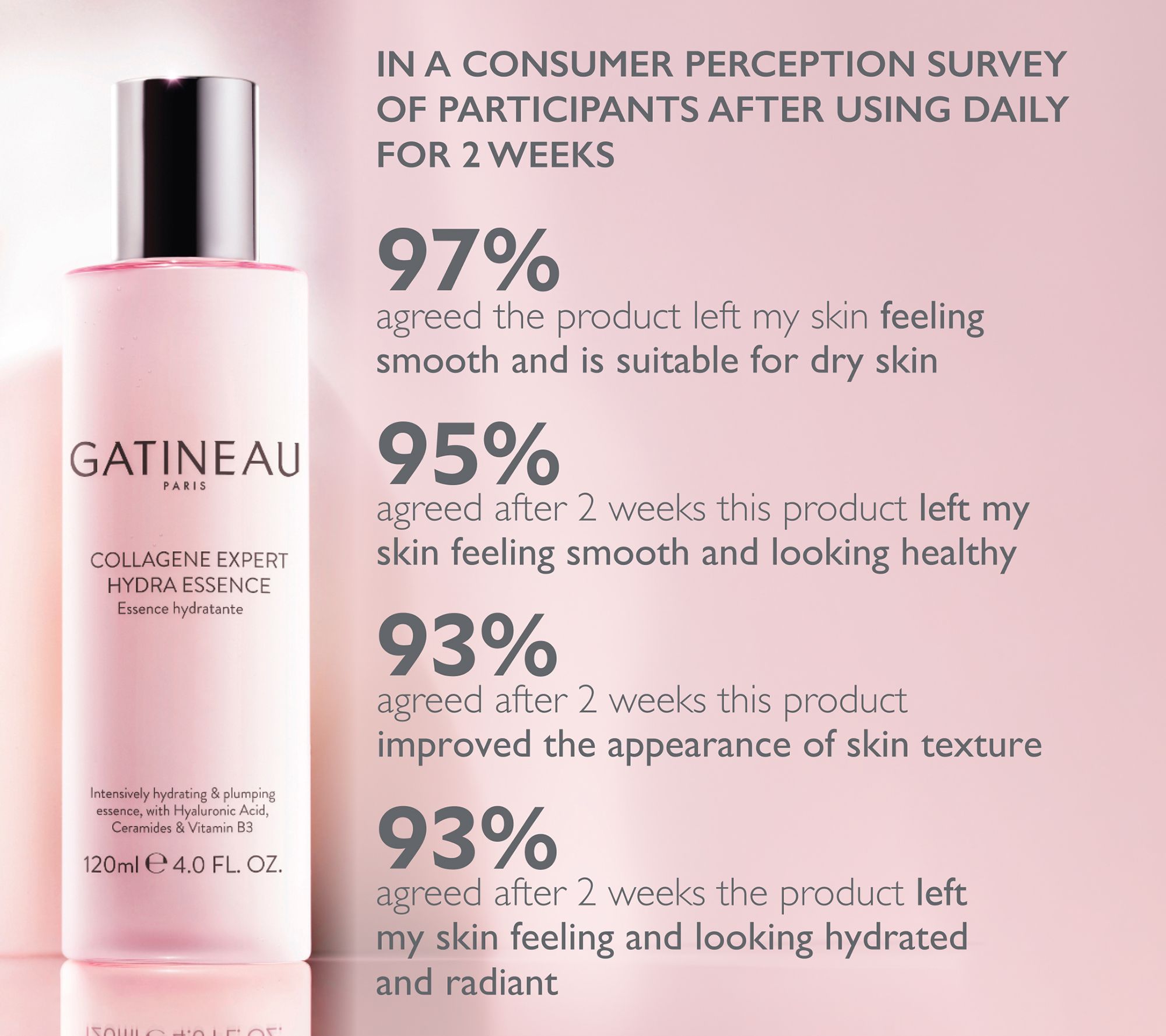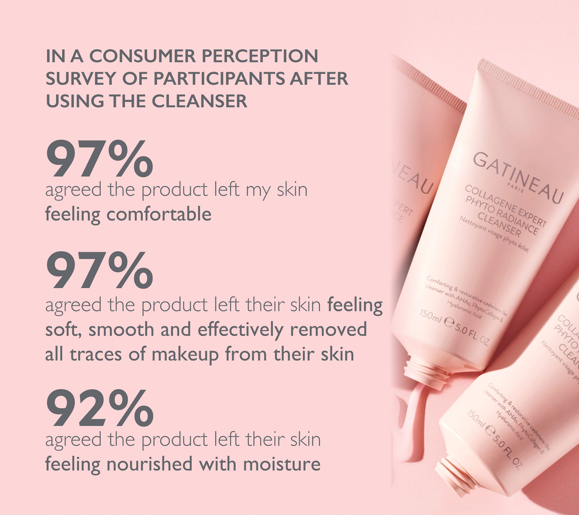 In a consumer perception survey of participants after using the cleanser: -- 97% agreed the product left skin feeling comfortable -- 97% agreed the product left their skin feeling soft and smooth and effectively removed all traces of makeup from their skin -- 92% agreed the product left their skin feeling nourished with moisture and nourished