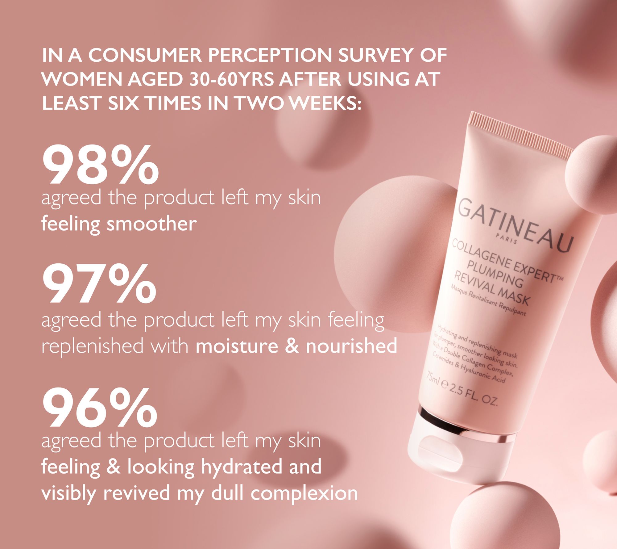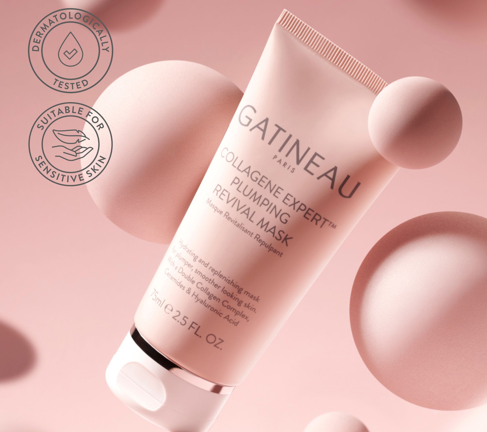 Gatineau Collagene Expert Plumping Revival Mask is formulated with a ceramide blend for skin moisturization and 2% niacinamide to help brighten the skin and improve the look of uneven skin tone. The mask is also formulated with hyaluronic acid, allantoin, and glycerin to help moisturize and improve the look of fine lines and wrinkles and help temporarily plump the appearance of then skin.