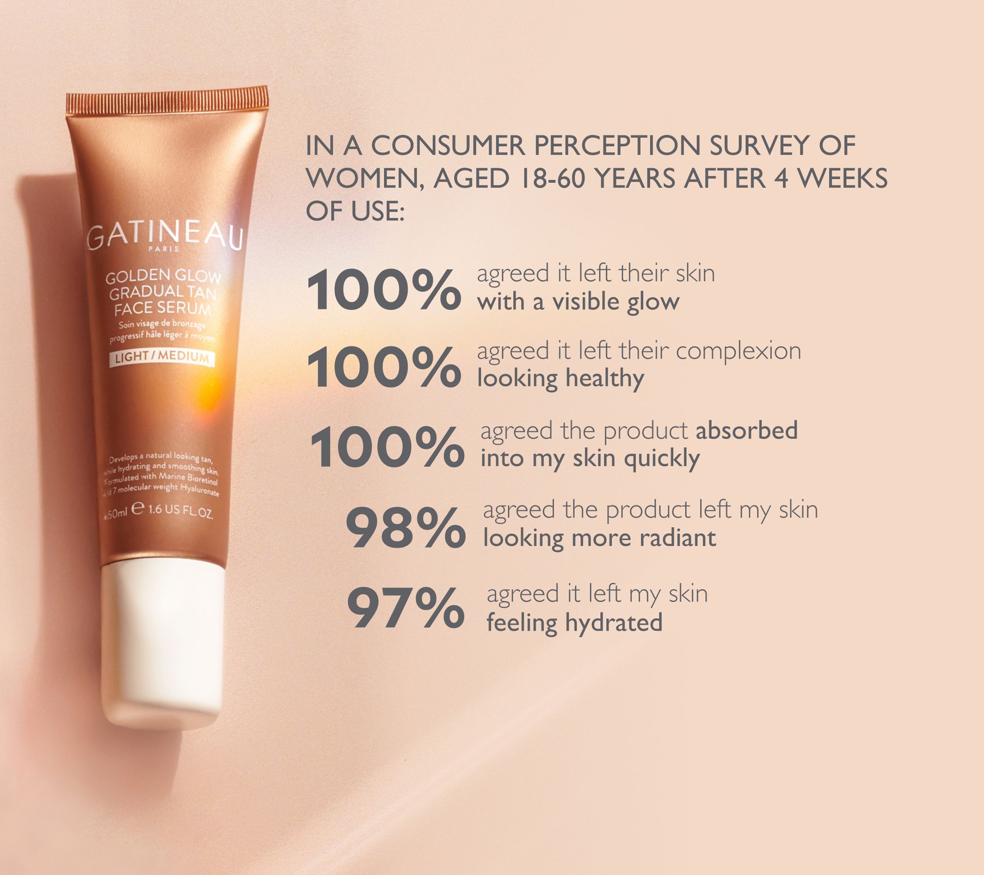 In a consumer perception survey of woman, aged 18 to 60 after four weeks of use: - 100% agreed it left their skin with a visible glow - 100% agreed it left their complexion healthy looking - 100% agreed the product absorbed into skin quickly - 97% agreed it left skin feeling hydrated