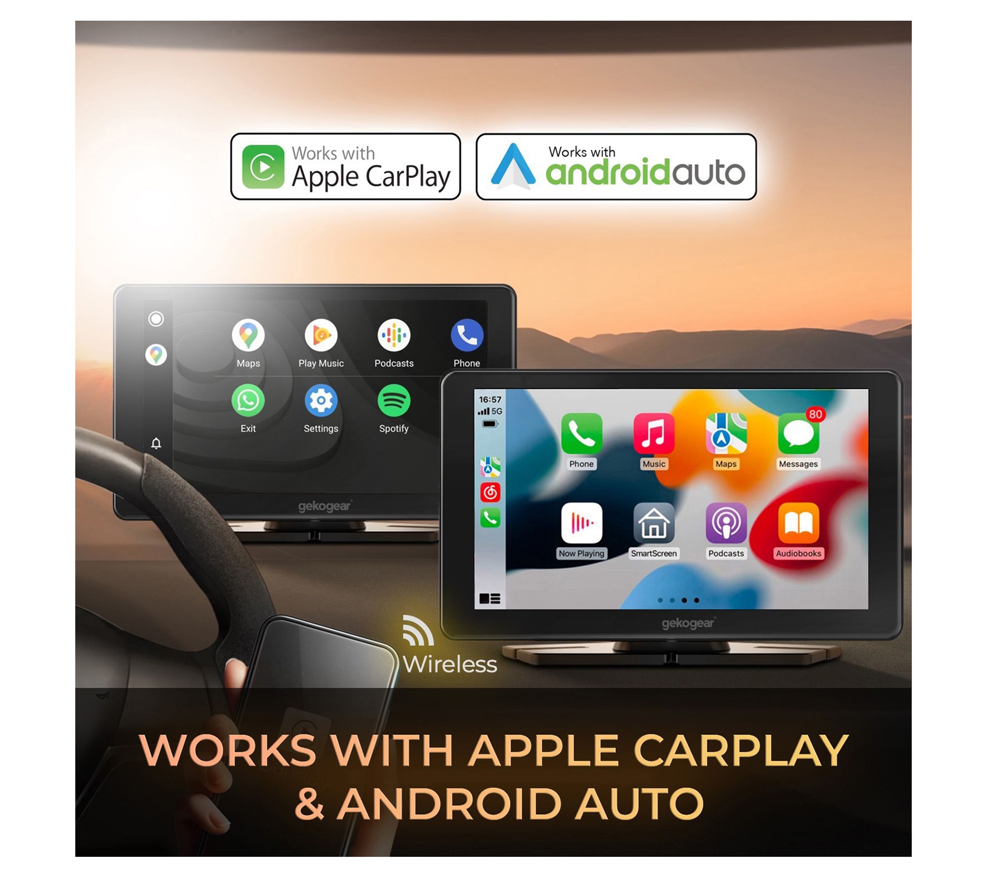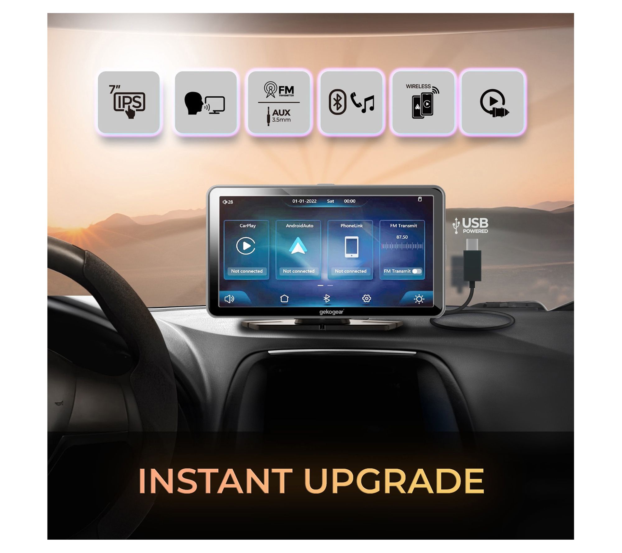 Wish your car had Apple CarPlay or Android Auto? Celebrate automotive connectivity with the GekoGear Orbit C100, a 7" display seamlessly integrated with both. Transform your car into a smart hub, effortlessly accessing apps, navigation, and entertainment with just a touch. Equipped with Wi-Fi and Bluetooth, it ensures hands-free calls and messages. Enjoy intuitive controls and crystal-clear visuals for an enhanced driving experience. From GekoGear.