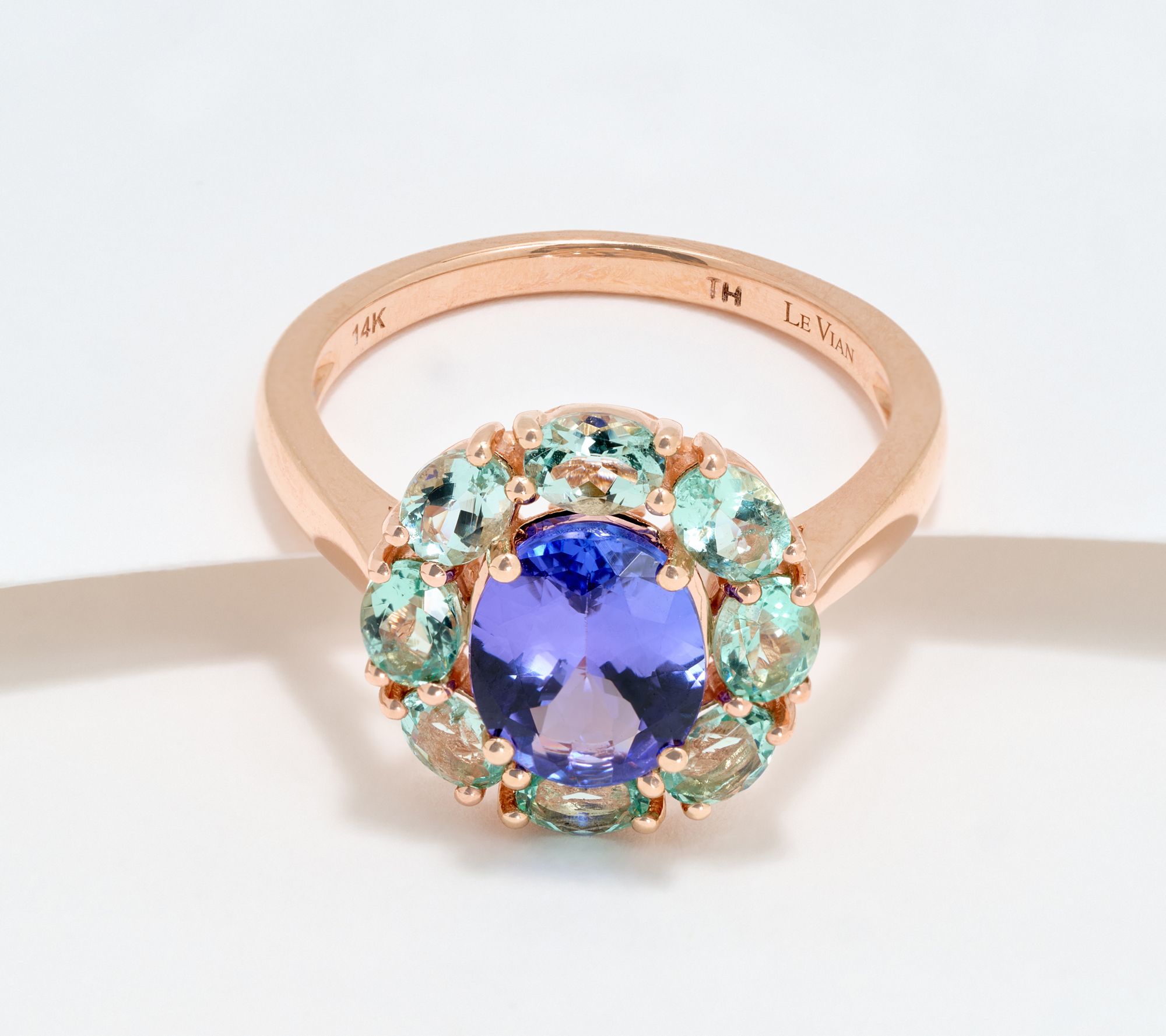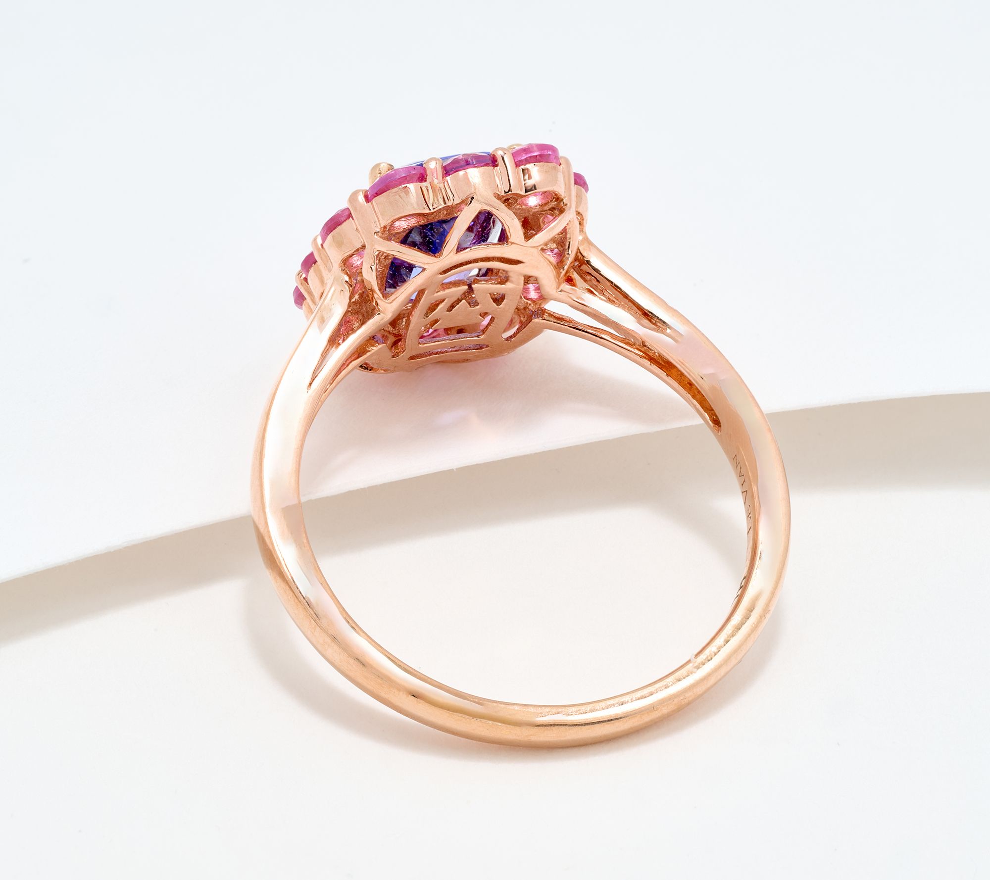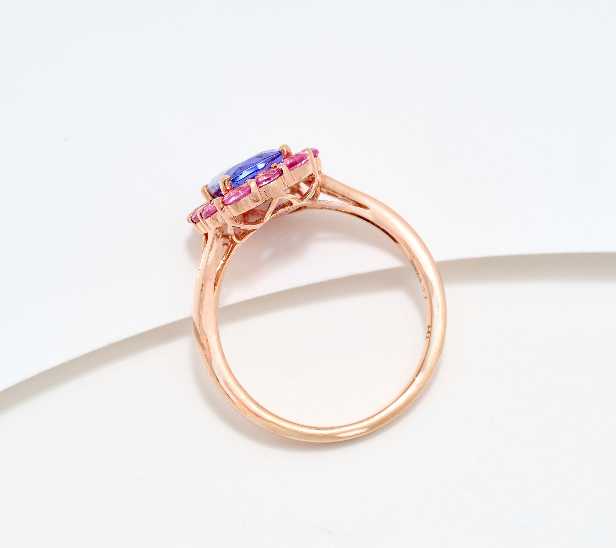 Bold color and dreamy sparkle come together in this 14K rose gold ring -- a brilliant finishing touch for everything from date-night attire to your favorite brunch look. Vivid tanzanite is paired with dazzling pink sapphire or Aquaiba for a modern twist, all set off by warm rosy gold. Whether worn solo or stacked with other favorites, this piece is made to stand out. From Gem Discoverer.