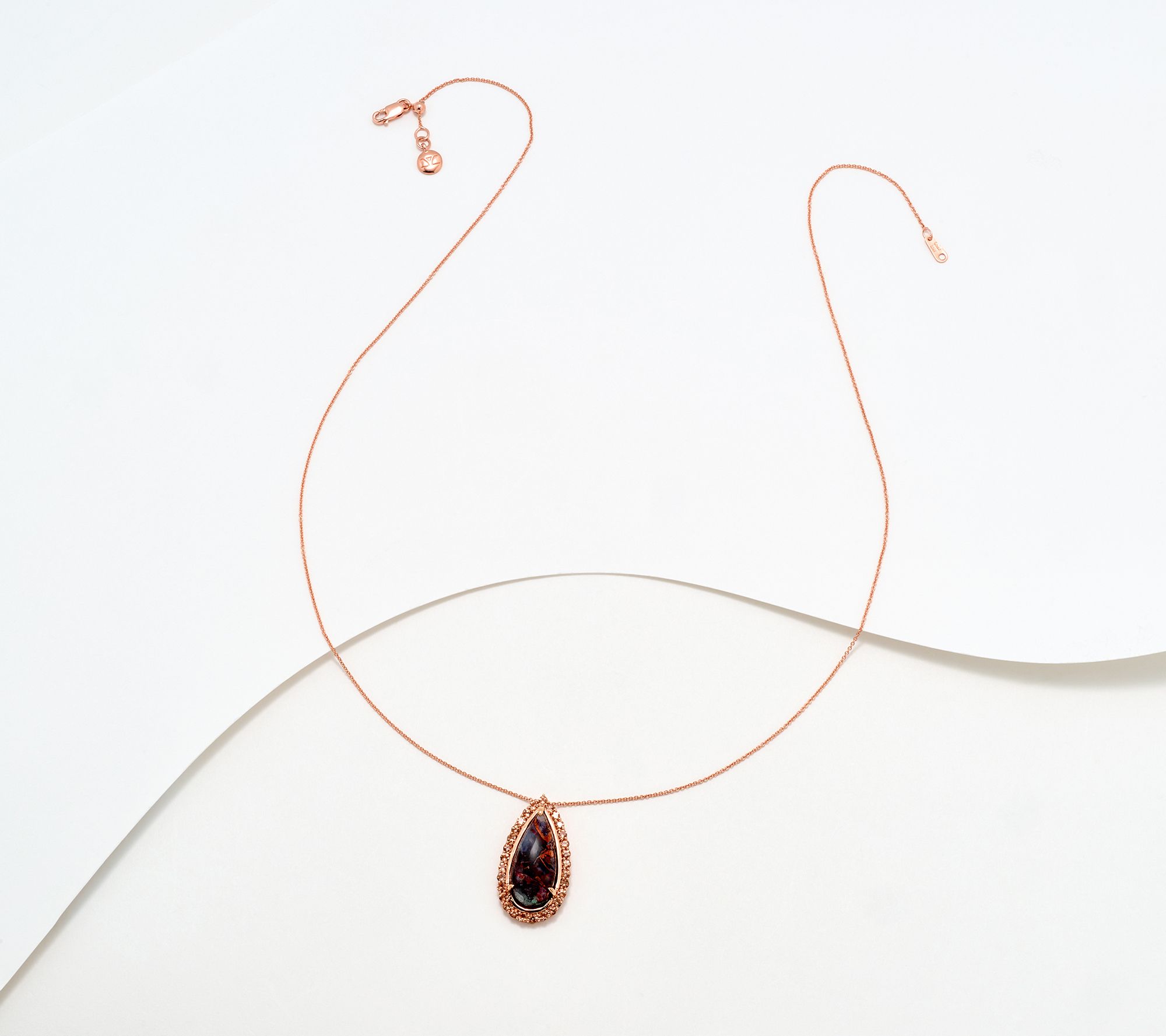 For evenings meant to be remembered, this stunning pendant brings a hint of intrigue to your look with a mesmerizing pear-shaped Aquadite Noir centerpiece. From Gem Discoverer.