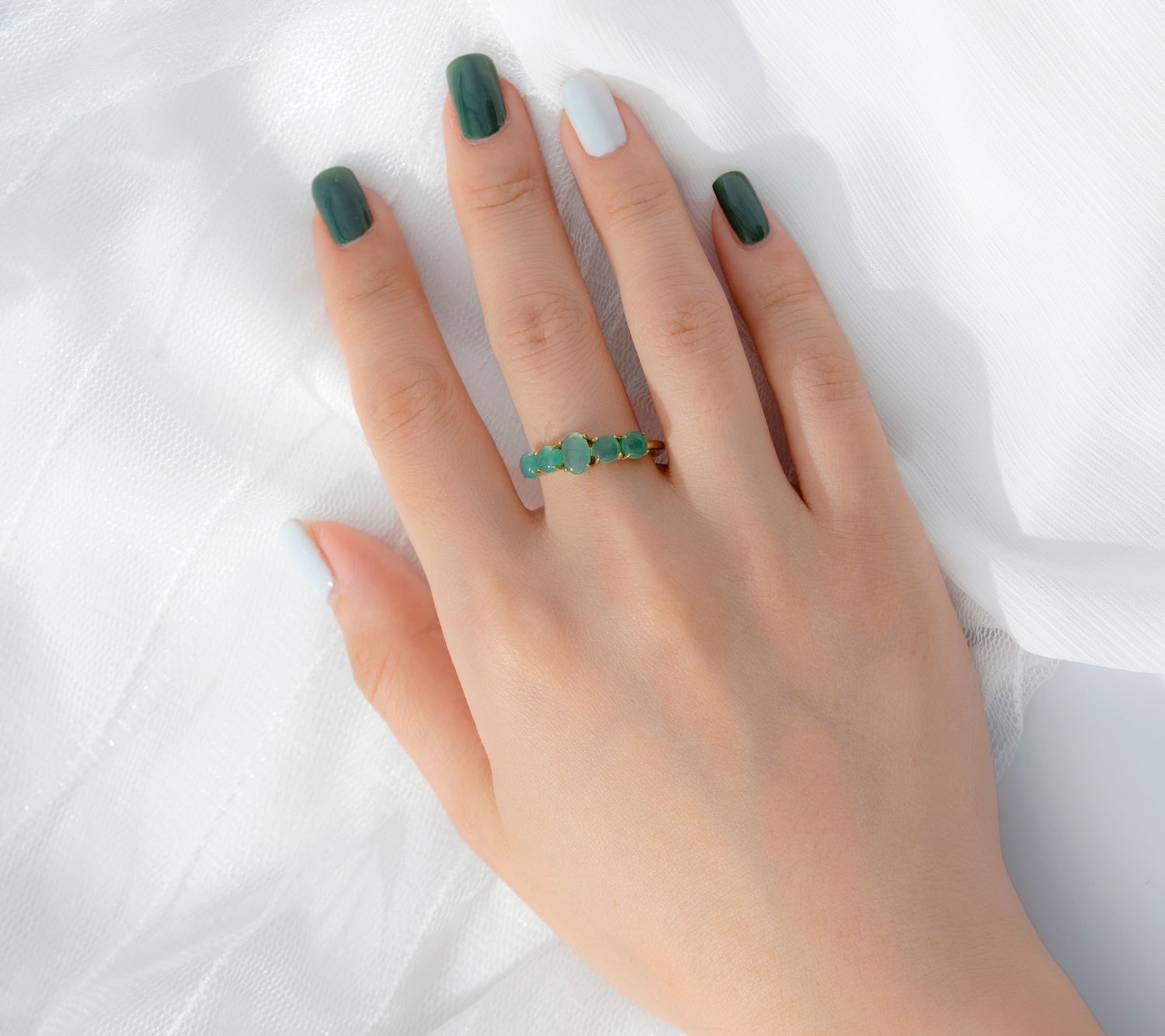 Add a splash of color and elegant style to your look with this beautiful ring, showcasing green agate gemstones prong-set in a row. From Gemour.