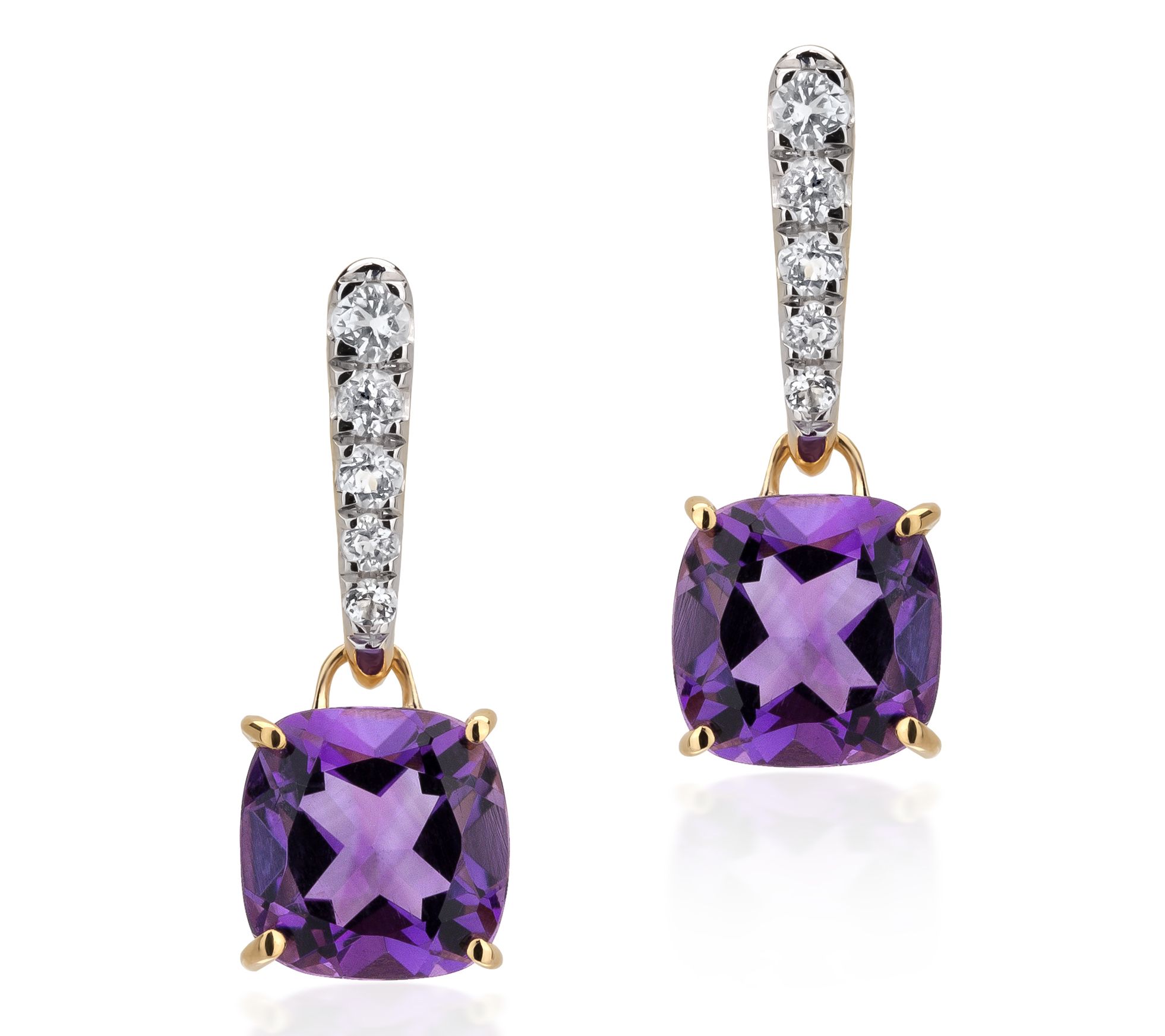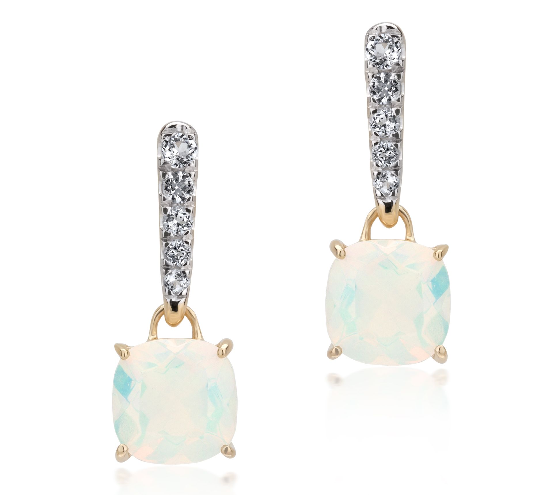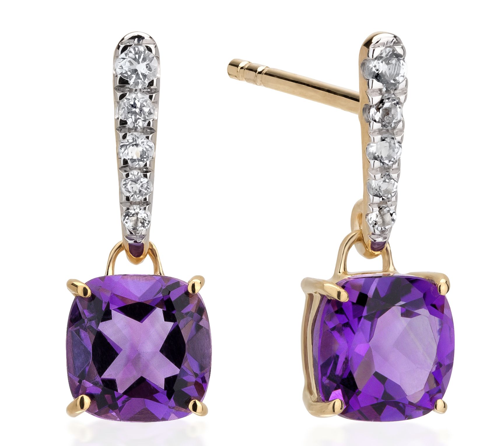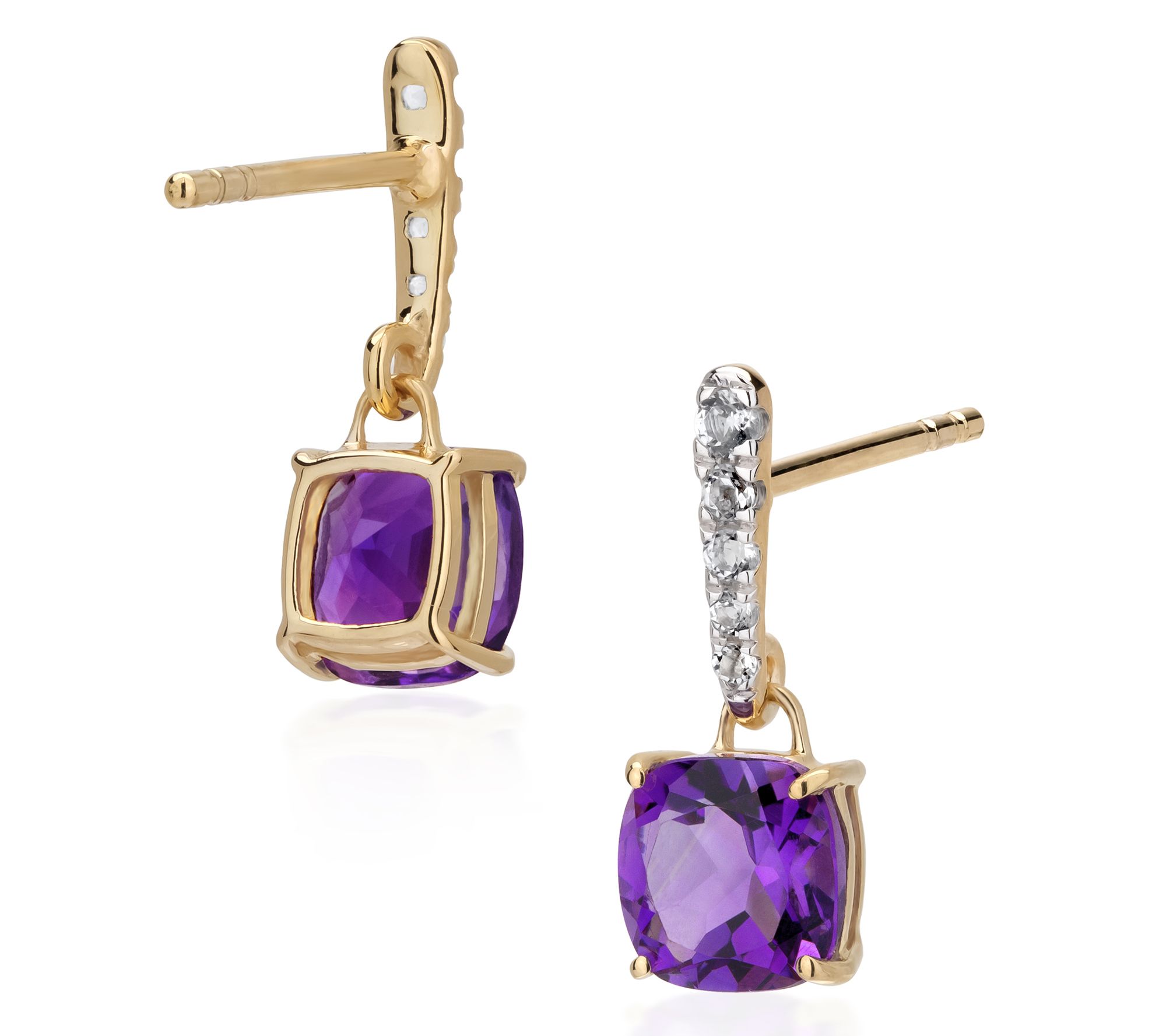 • Prong-set, cushion-cut gemstone dangle; round prong-set white topaz on bar