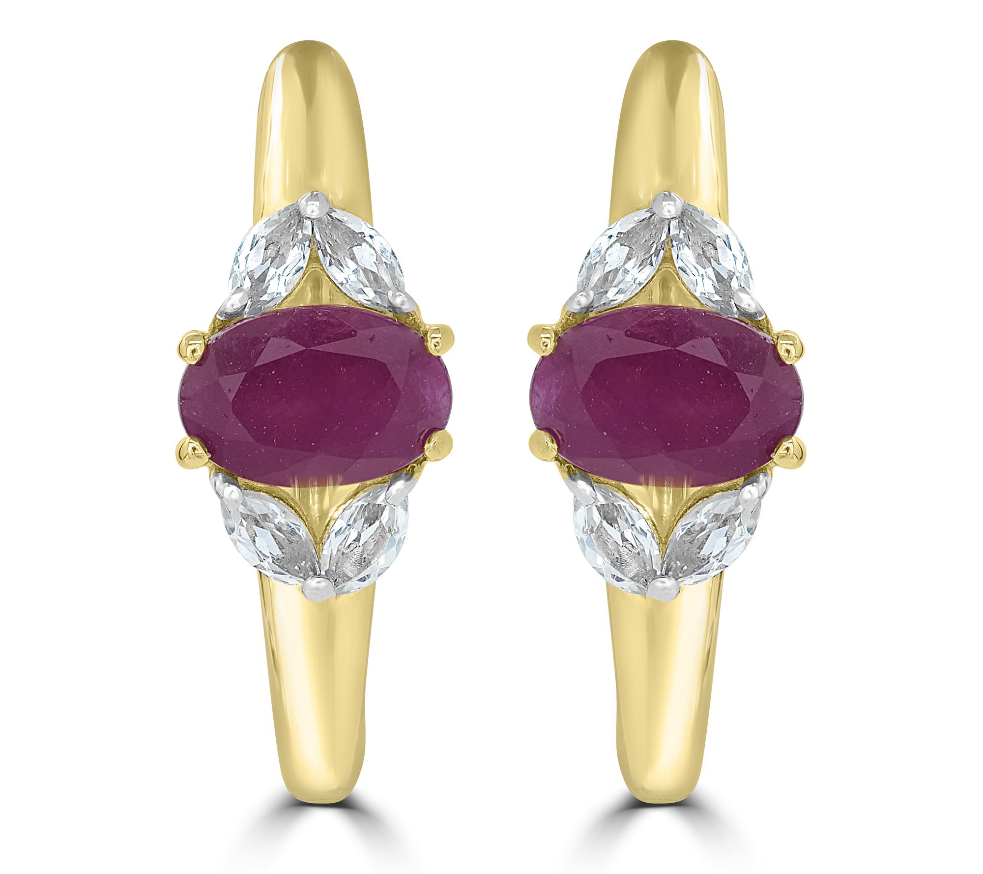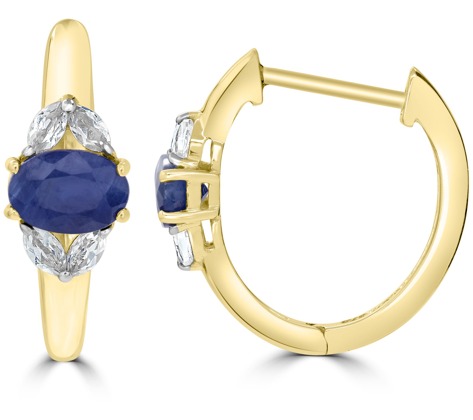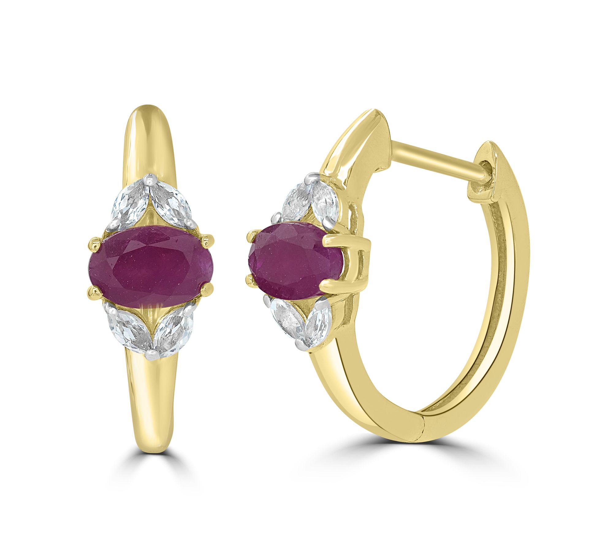 • Oval-cut, prong-set gemstone set horizontally surrounded by prong-set, marquise white topaz stones on the front top of hoop