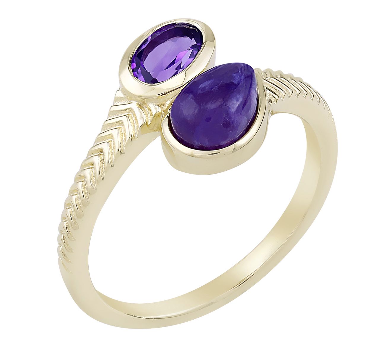 • Oval, faceted gemstone on one side of bypass design; pear-shaped opaque gemstone cabochon on th