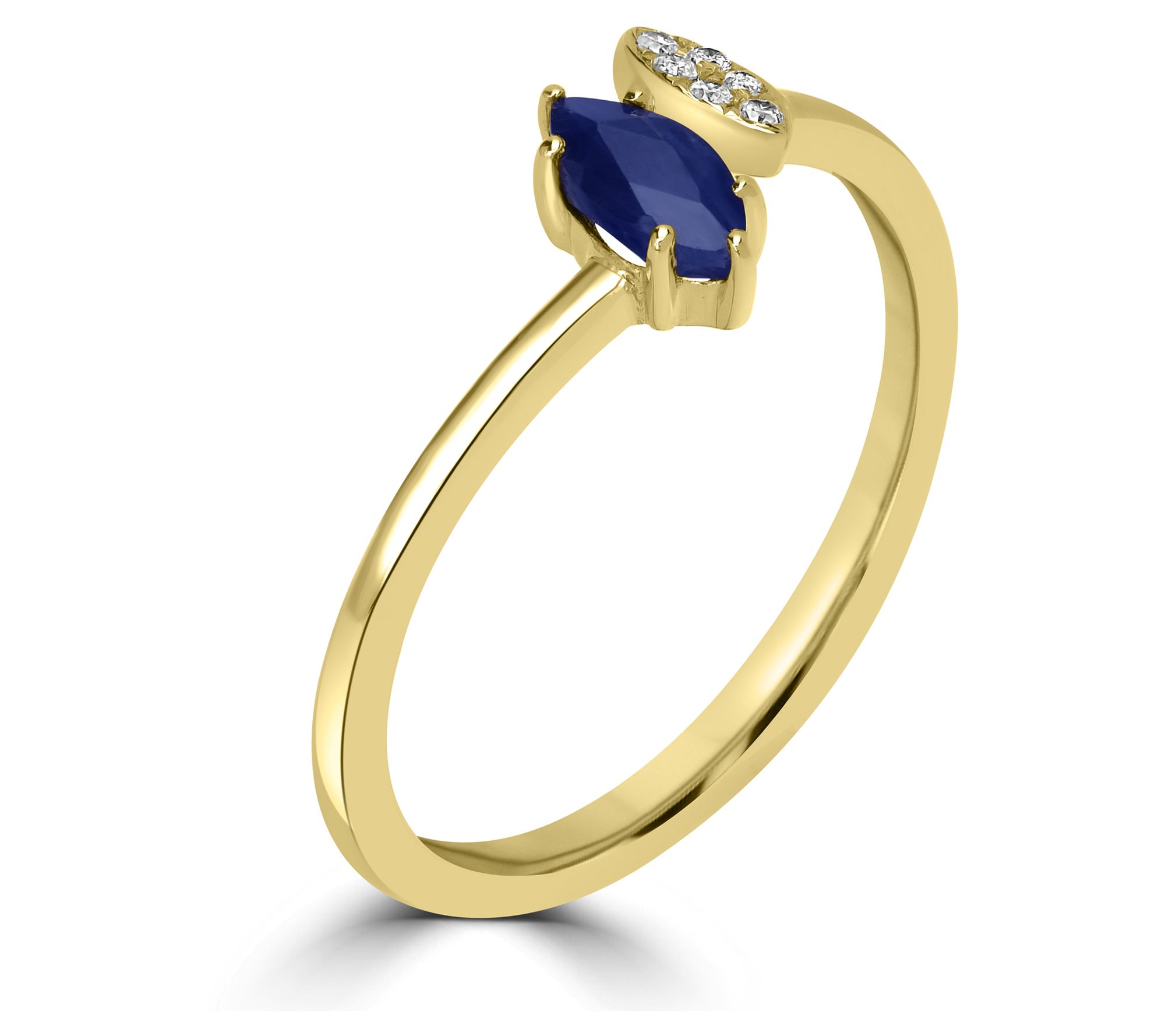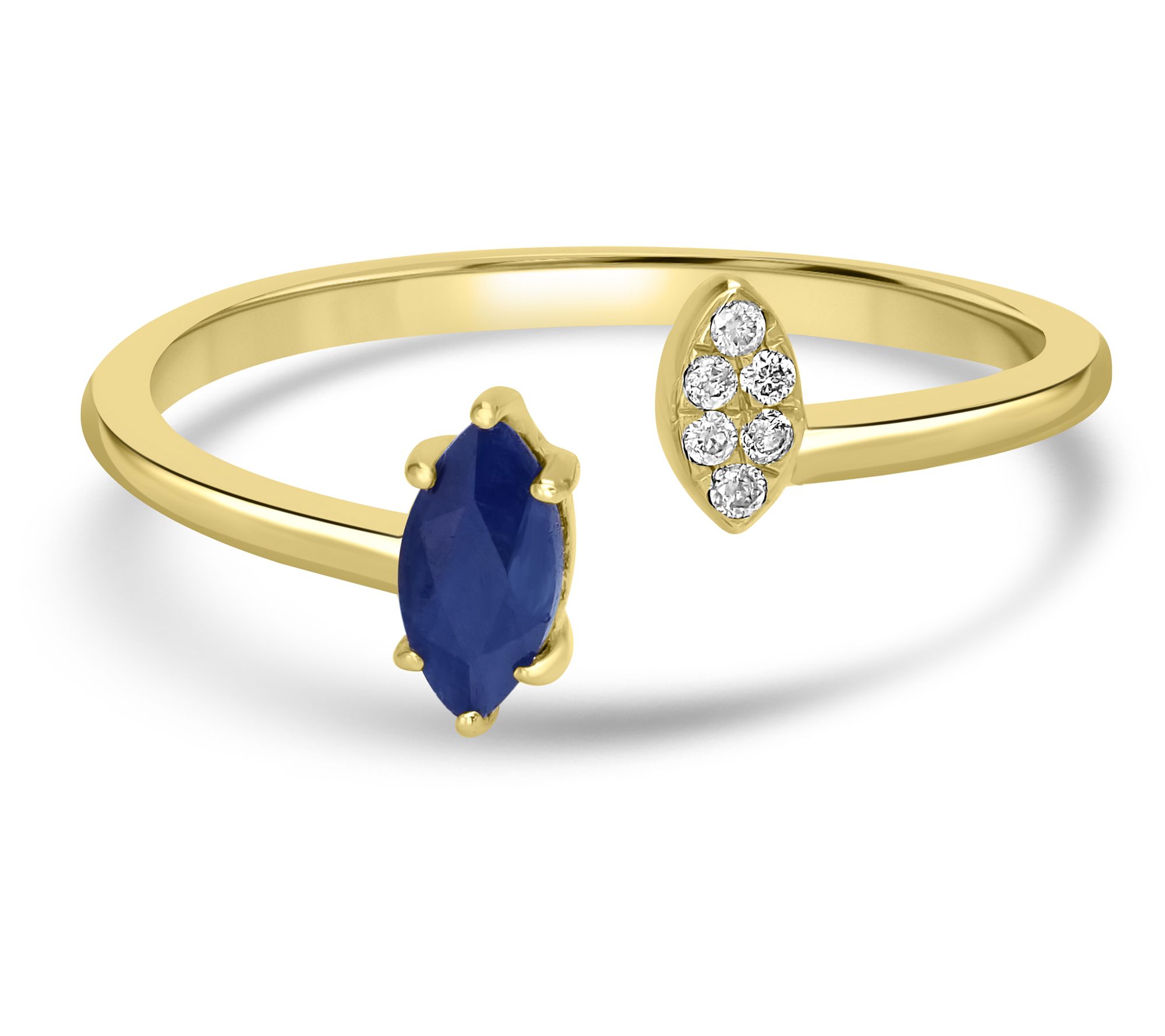 Prong-set marquise gemstone and pave-set round white topaz on either side of cuff ring; 14K yellow gold high polish band