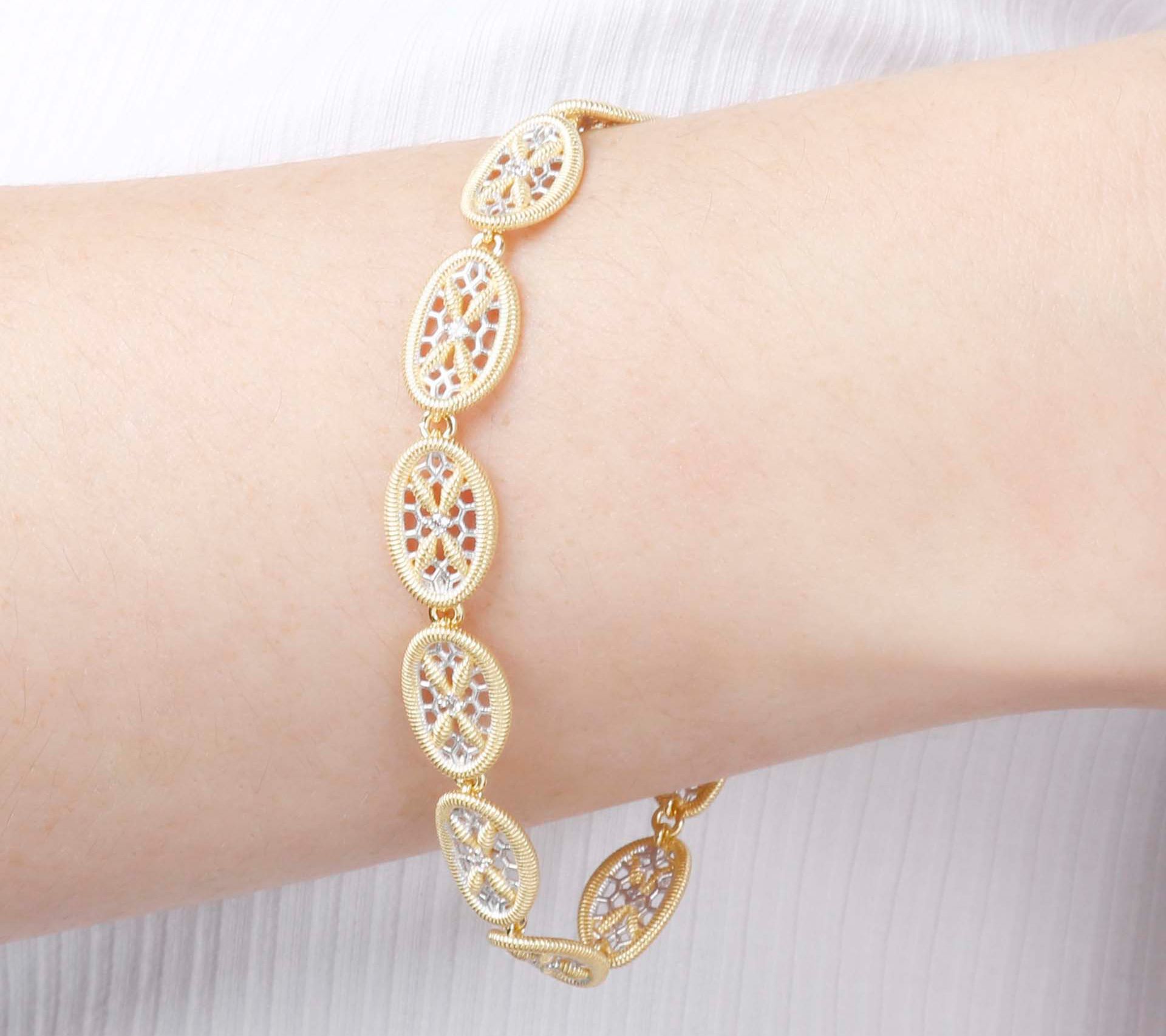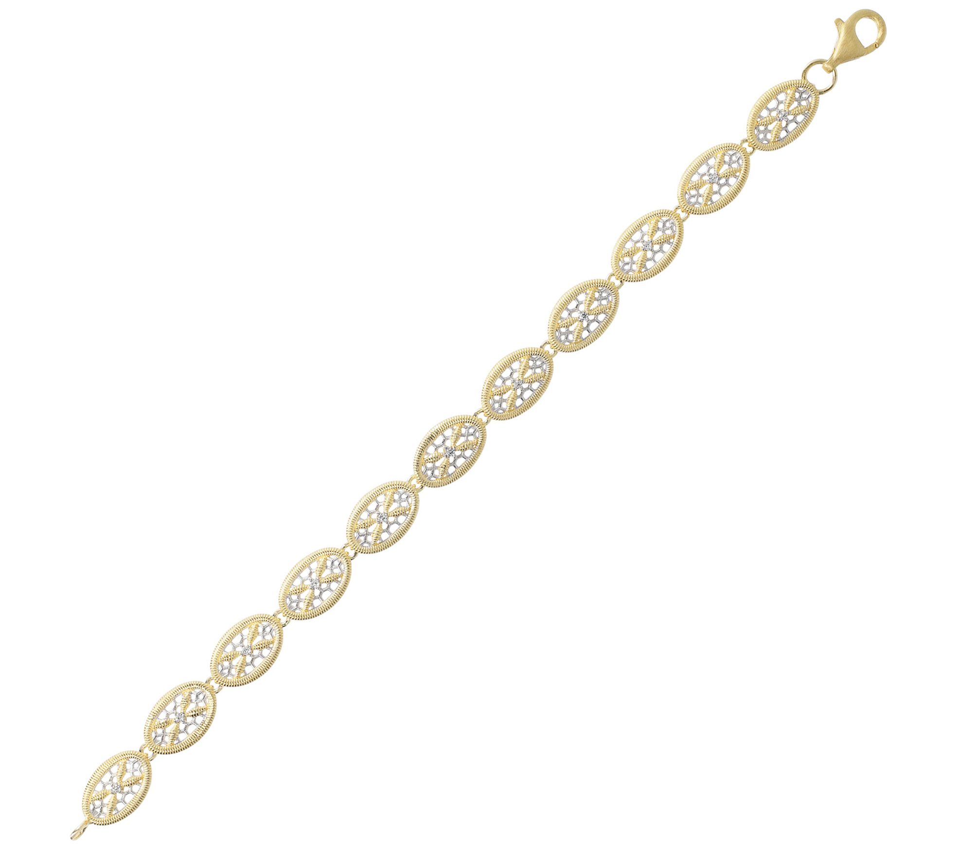 - Oval-shaped openwork links; round, prong-set white topaz gemstones in textured borders