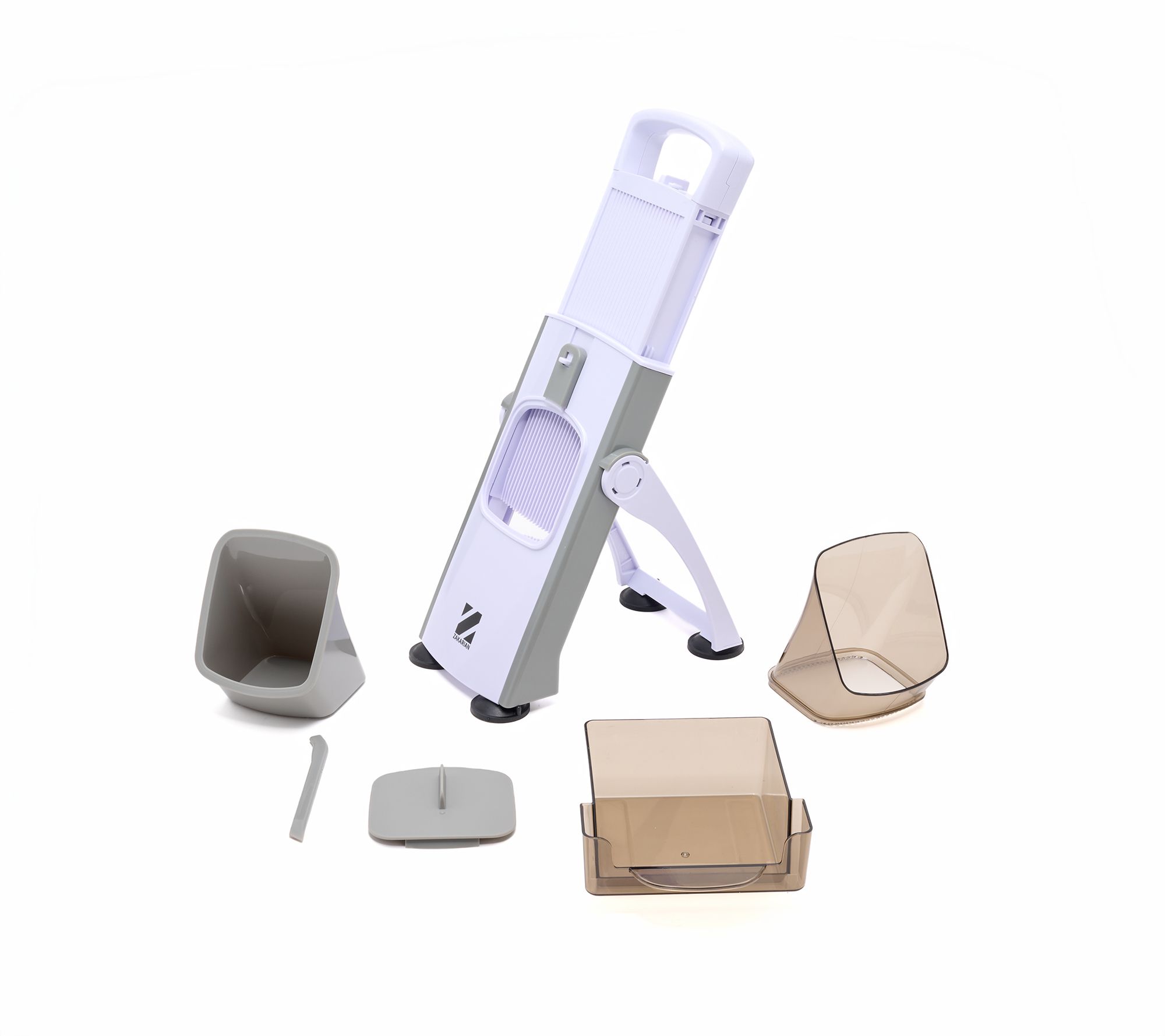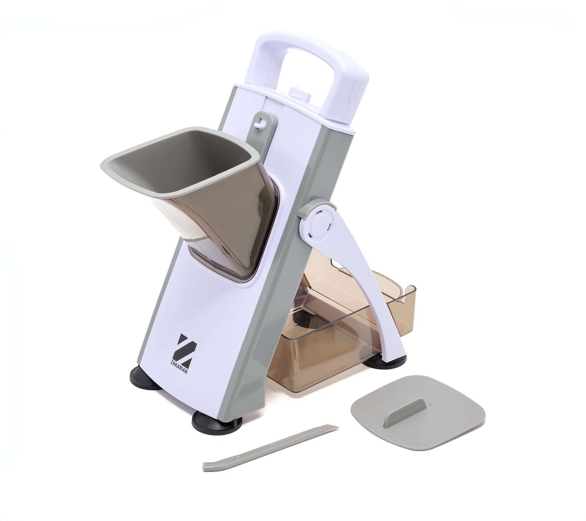 • Includes upright adjustable mandoline, pusher, protective cover, catch basin, and cleaning brush