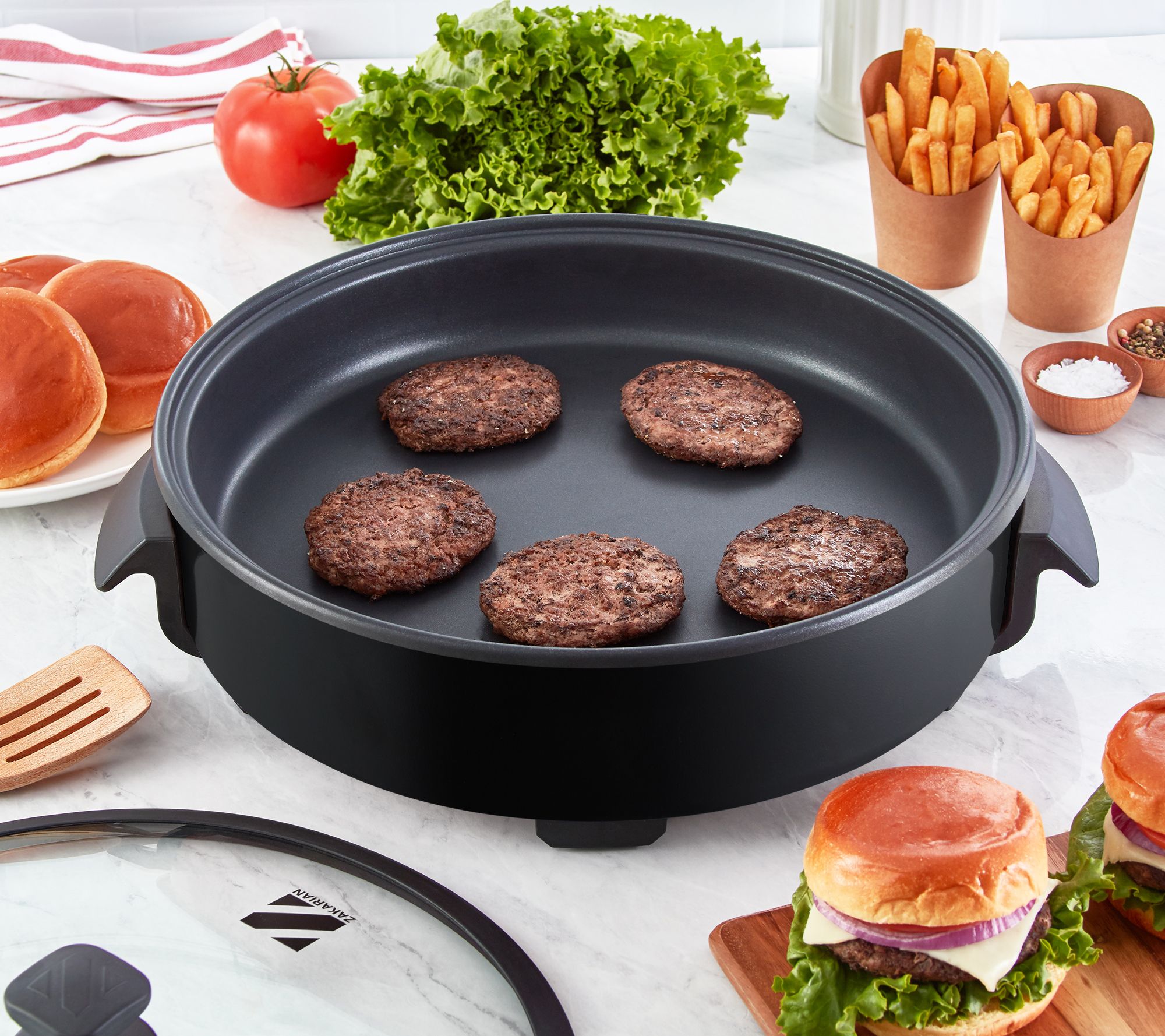 Includes electric skillet, tempered glass lid, stainless steel rack, and 10 recipes