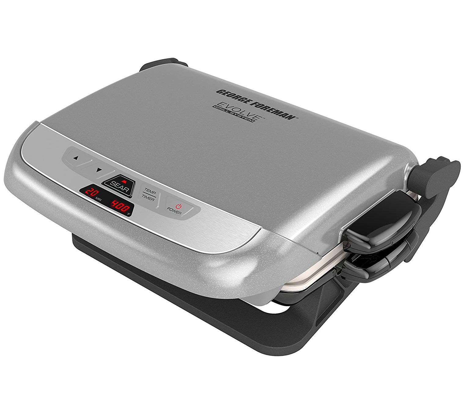 Cook breakfast, lunch, and dinner for the whole family with the George Foreman Evolve grill. This versatile appliance has digital controls and comes equipped with interchangeable plates. Adjustable cooking angle allows you to lay the grill flat or on a slight tilt for extra efficiency. From George Foreman.