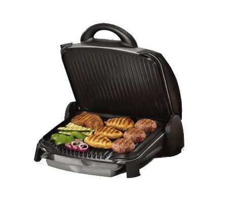 Feed a hungry crowd with George Foreman's Double Champ Grill. Its 200" sq cooking surface holds up to 12 burgers or chops at a time. Nonstick grill plates on top and bottom cook foods in minutes. And fat drains right into the drip tray. Variable temperature control. 30-minute timer. Indoor/outdoor use.