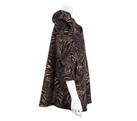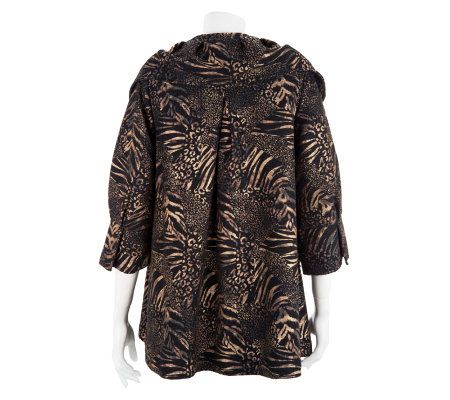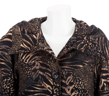 Fully lined, tailored collar, button-front closure, 3/4-length sleeves with turn-back cuffs, two front pockets, rear inverted pleat, allover animal print