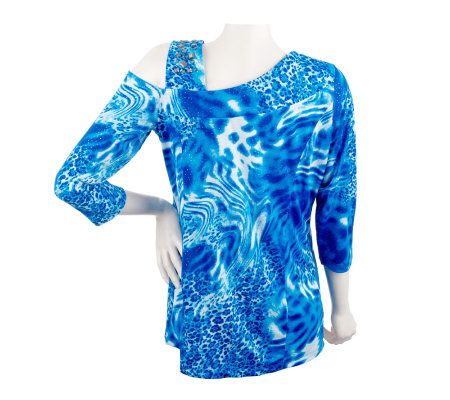 Daringly different. With a stud-accented, asymmetrical neckline, and one open shoulder, this animal print top helps you break out of your same old, same old wardrobe routine. From Simonton Says by George Simonton.