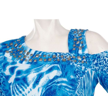 Asymmetrical neckline with stud detail, 3/4-length sleeves, one open shoulder, allover print, front and rear princess seams, straight bottom hem