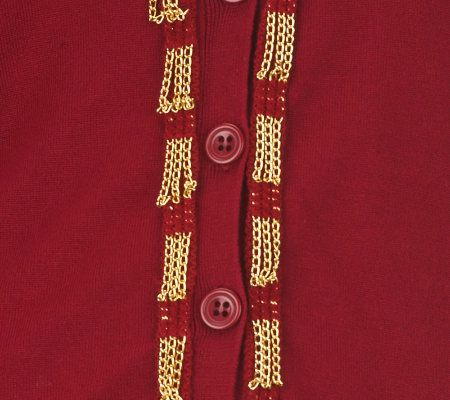 Let's hear it for the boyfriend cardigan! Distinctive chain trim lines the V-neckline and button-front placket of this top, giving it unique charm that goes with jeans, leggings, and more. Now, that's something to cheer about. From Simonton Says by George Simonton.