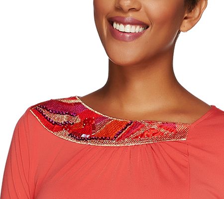 Striking style that works for every day. Fashioned with a scoop neckline that has embroidered, beaded, and shirring detail, this bold knit top makes any ensemble pop with the fashionable flair. Simply pair it with a slimming skirt or your favorite skinny jeans, and you're good to go. From Simonton Says by George Simonton.