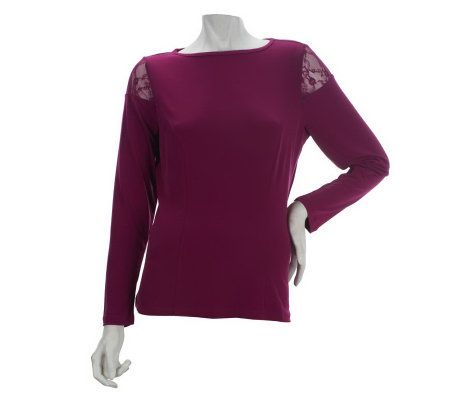 Oh, this is one top that won't get the cold shoulder. No, you'll reach for this solid-colored top again and again, as it's gorgeously designed with a lace shoulder inset, bateau neckline, and front princess seam detail. From George Simonton.