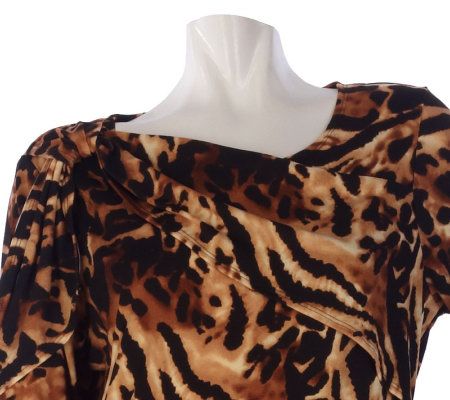 Allover print; front draped, attached overlay; scoop neckline; long sleeves