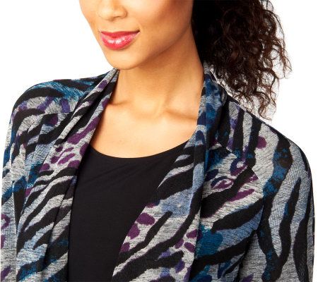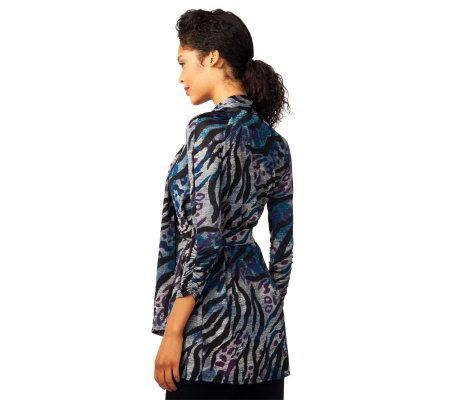 Diversify your style profile. Perfect for layering, this drape-front cardigan features an allover print that'll match multiple items of clothing. The 3/4-length sleeves make it great for any season, while the removable belt provides just the right fit. From Simonton Says by George Simonton.
