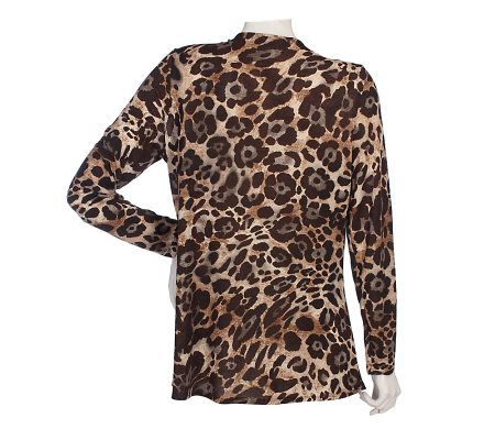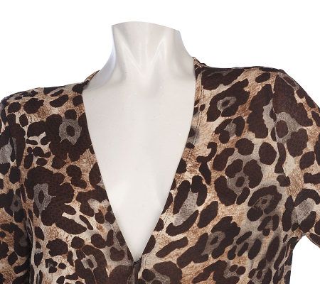 • Drop V-neckline with hook-and-eye front closure; open draped front; long sleeves; allover print