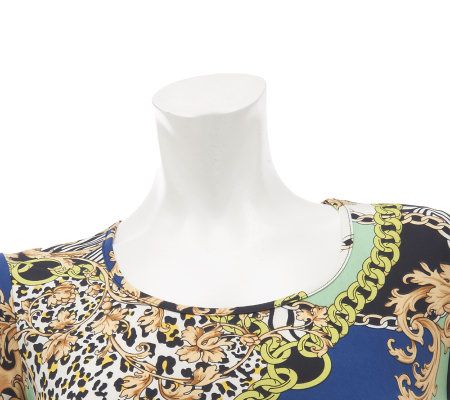 Scoop neckline, allover status print, cap sleeves, straight bottom hem