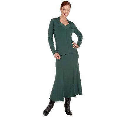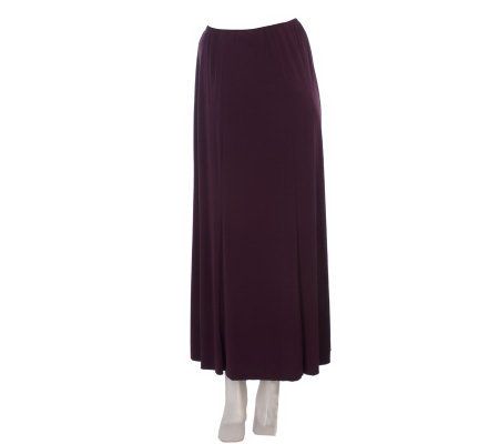 Let it flow. Six gore panels and a lettuce-edge hem create a fashionably feminine fit on this stretch knit skirt. From George Simonton.