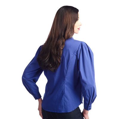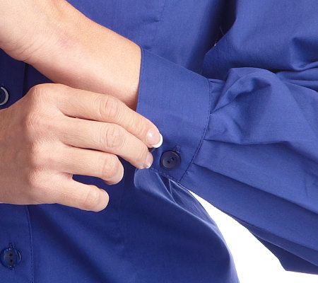 • Long sleeves with two-button cuffs, button front, front and rear princess seams