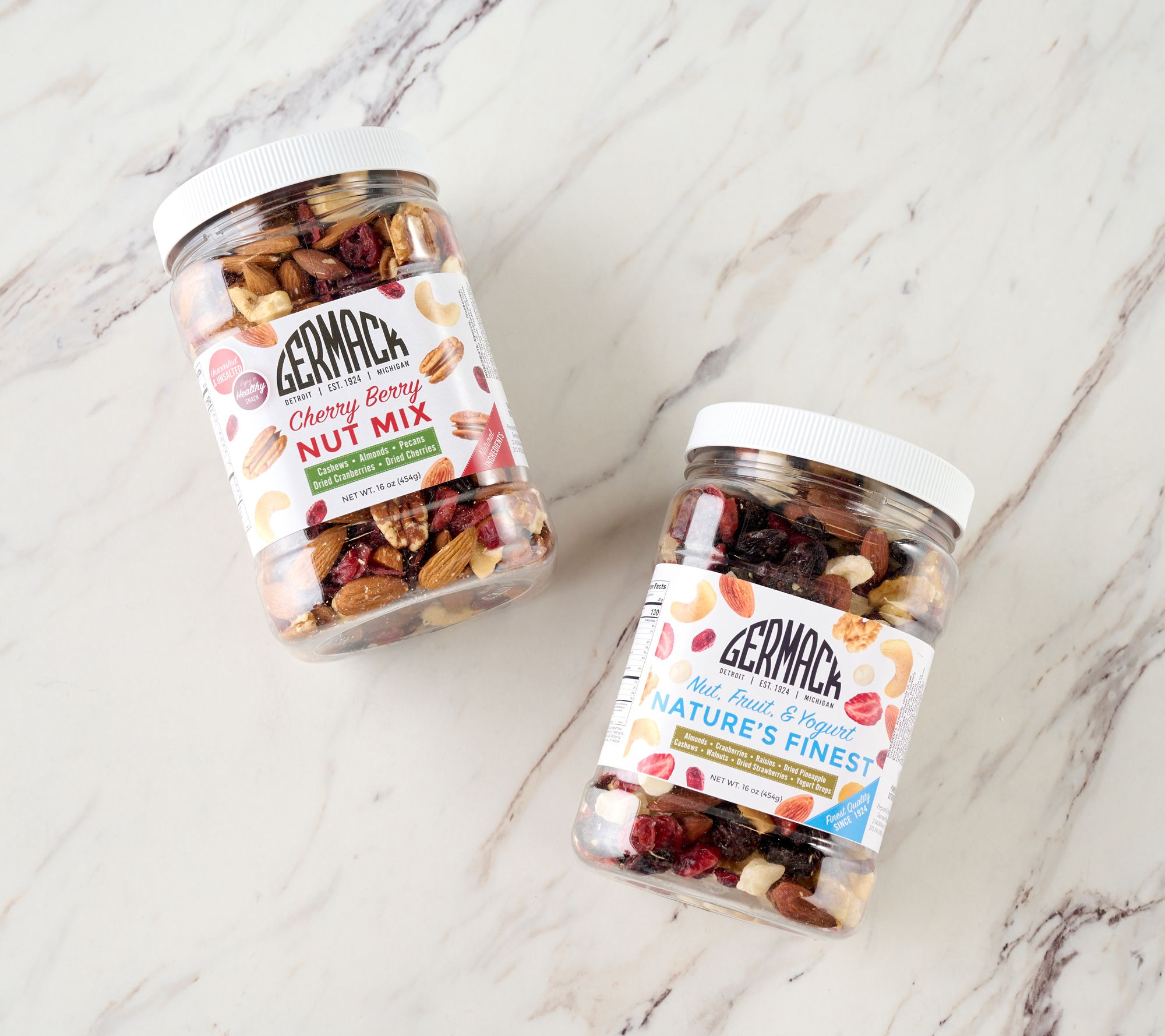 Whether you're snacking at home, in the office, or on a hike, these delightful Cherry Berry and Nature's Finest nut assortments are the perfect choice. Experience the delightful combination of nuts, fruits, and yogurt drops in every bite. From Germack.