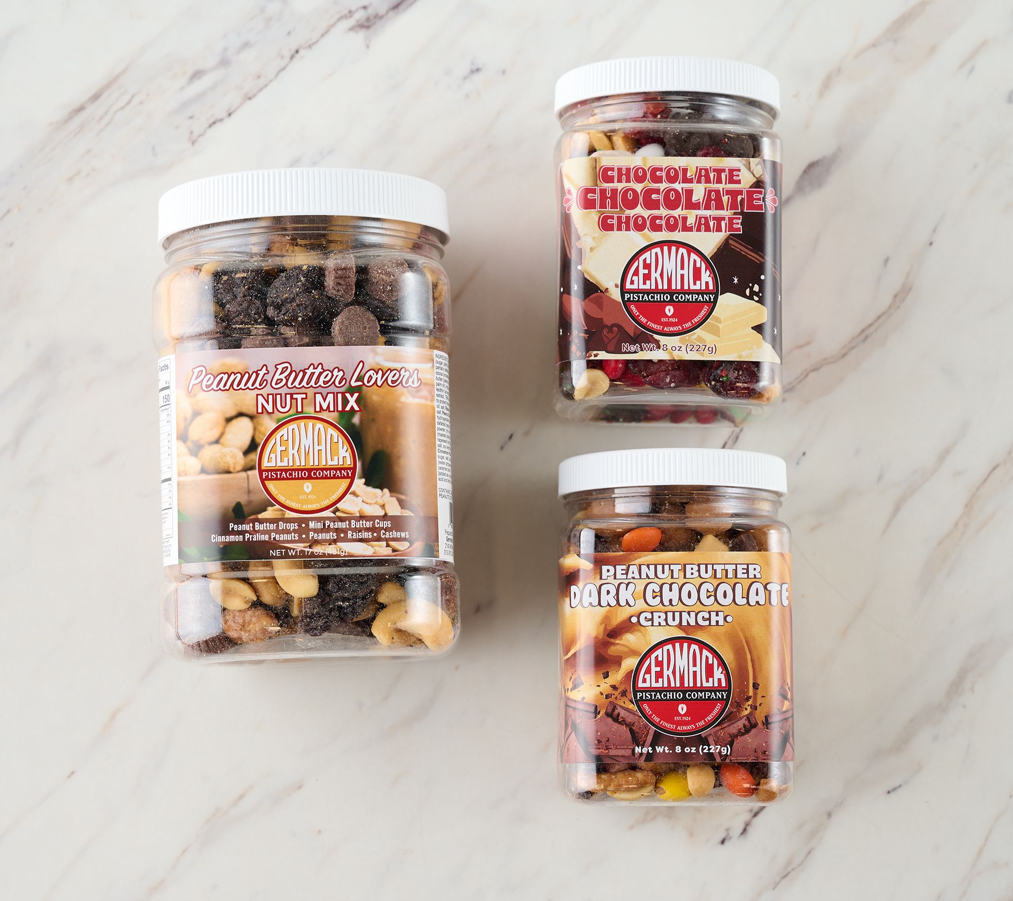 Includes three jars of Valentine's Day sweet nut mixes: 17-oz Peanut Butter Lovers jar, 8-oz Chocolate Chocolate Chocolate mini jar, and 8-oz Peanut Butter Dark Chocolate mini jar