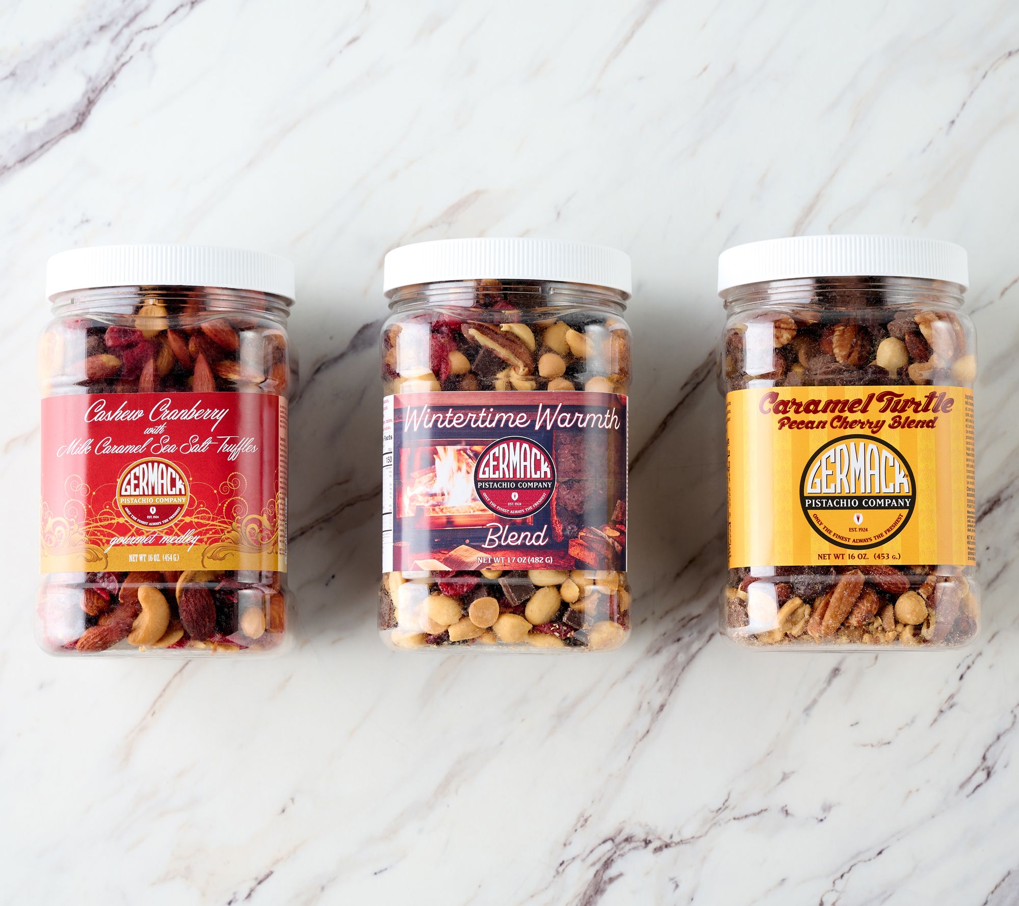 Come in from the cold and enjoy a handful of these sweet and salty fruit and nut mixes. Satisfy your cravings with one of these flavorful finds -- Wintertime Warmth, Caramel Turtle Pecan Cherry Blend, and Cashew Cranberry with Sea Salt Truffles. From Germack.
