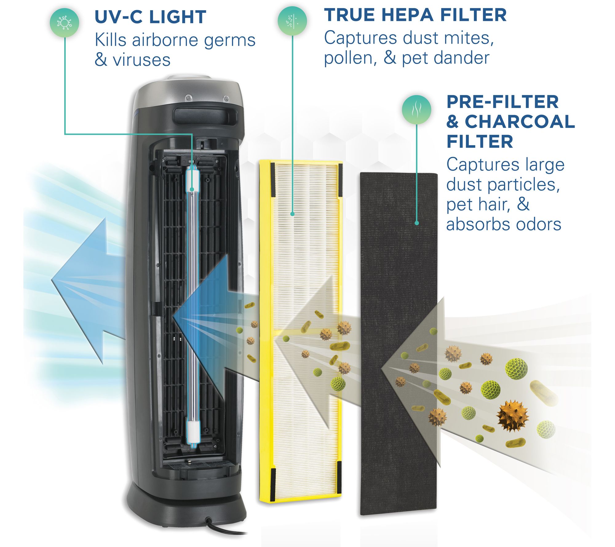 HEPA filter captures up to 99.97% of dust and allergens as small as 0.3 micron
