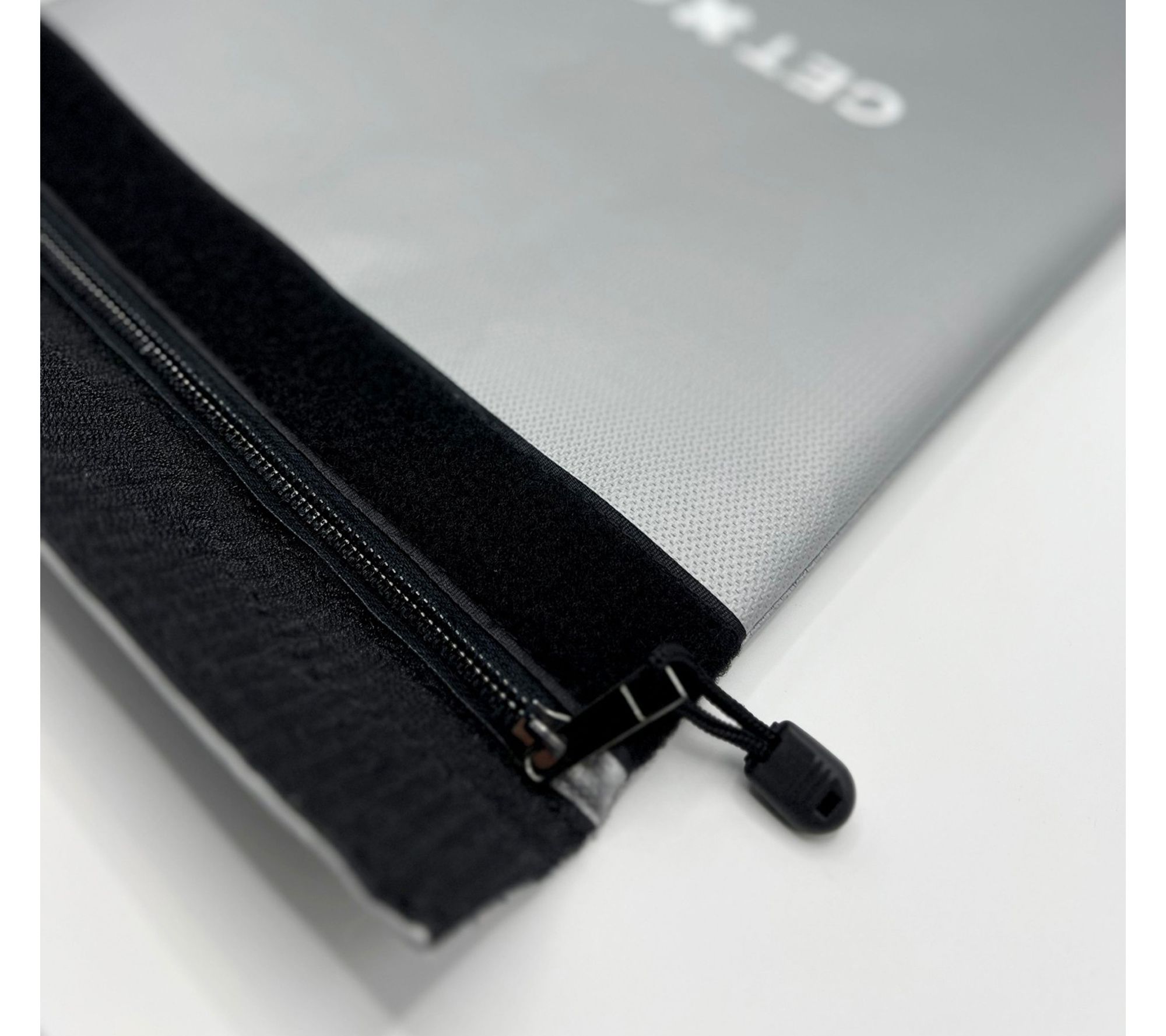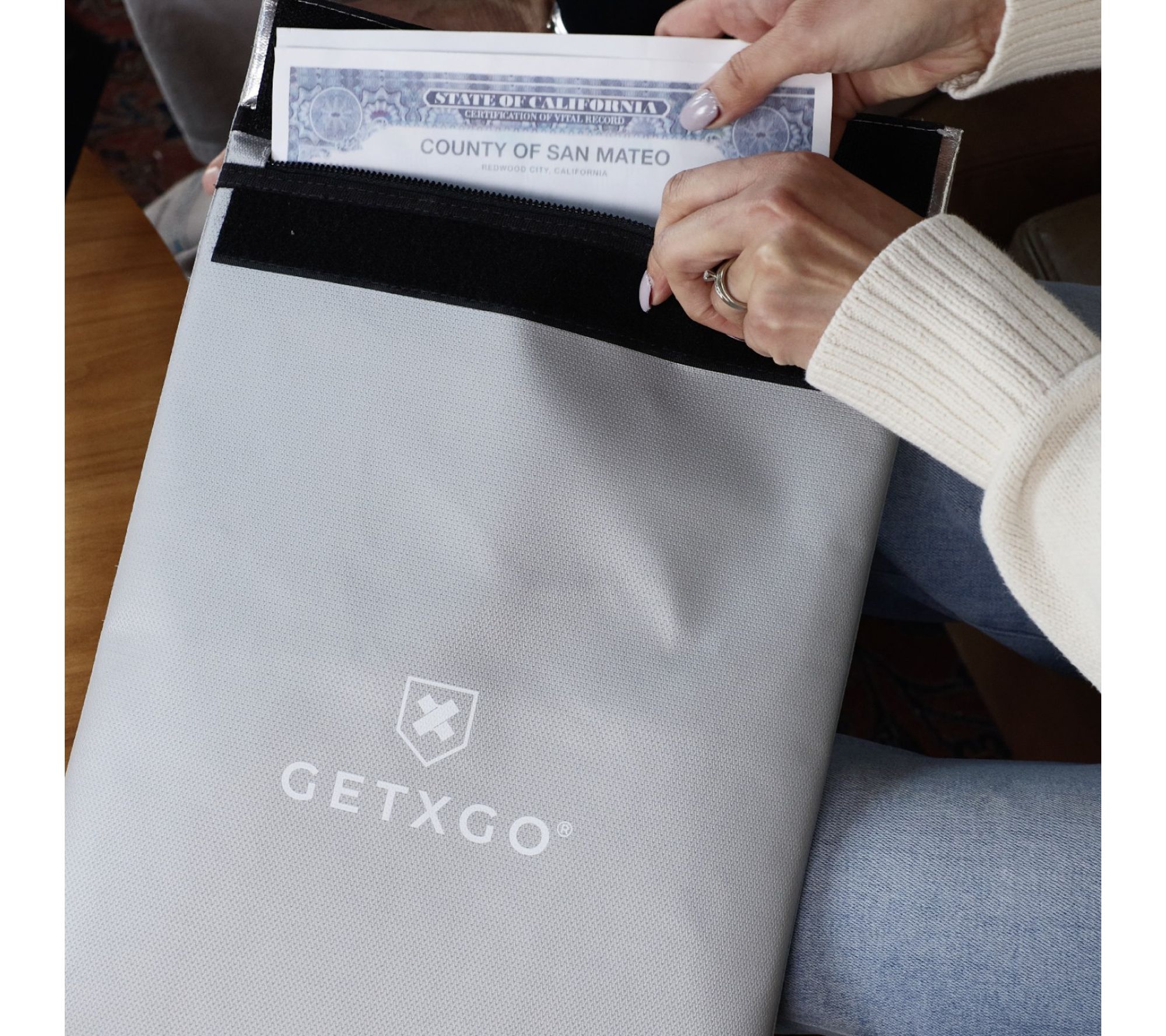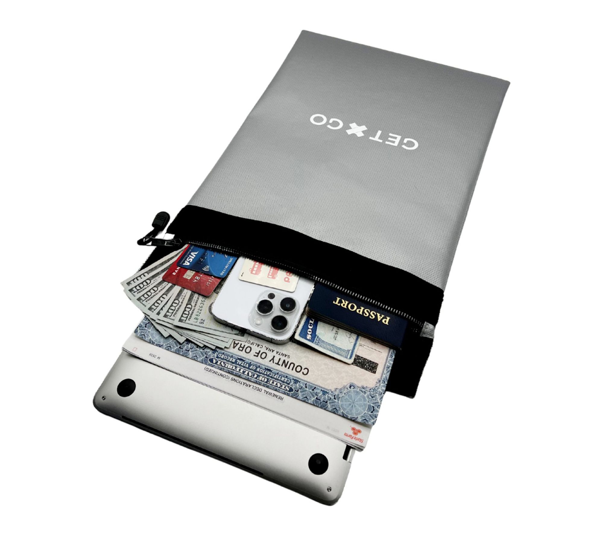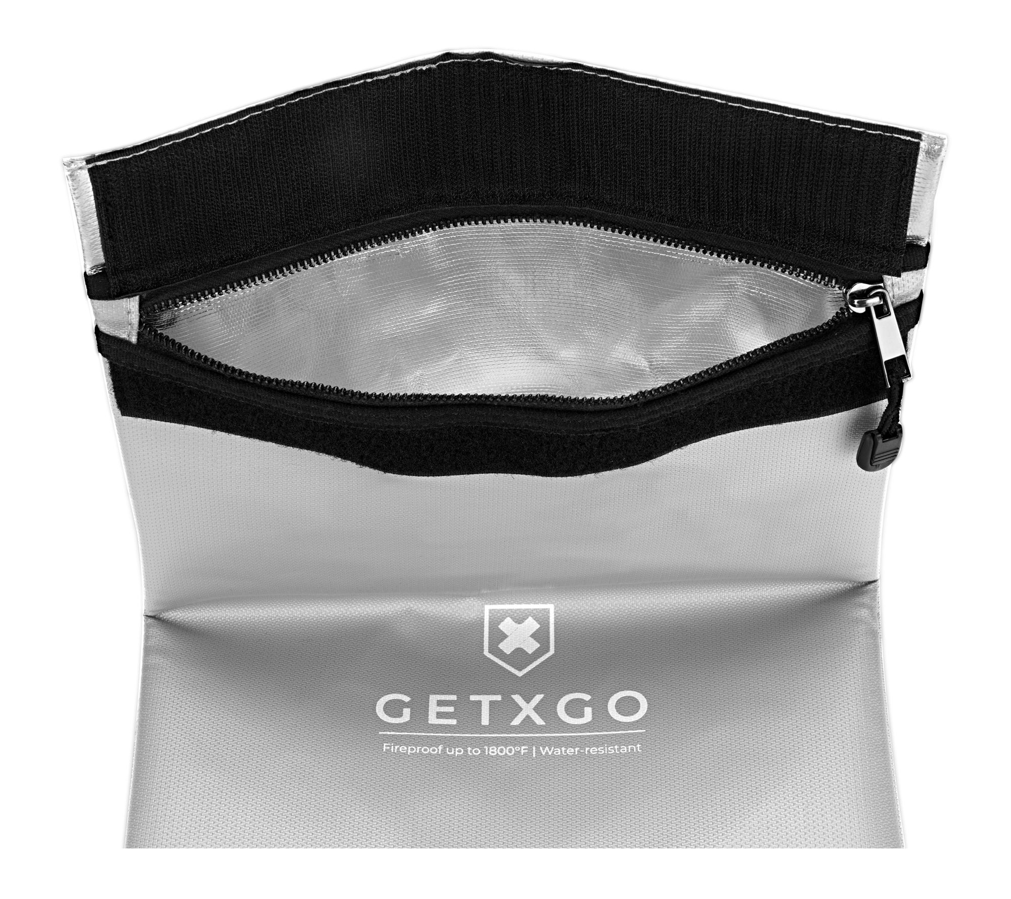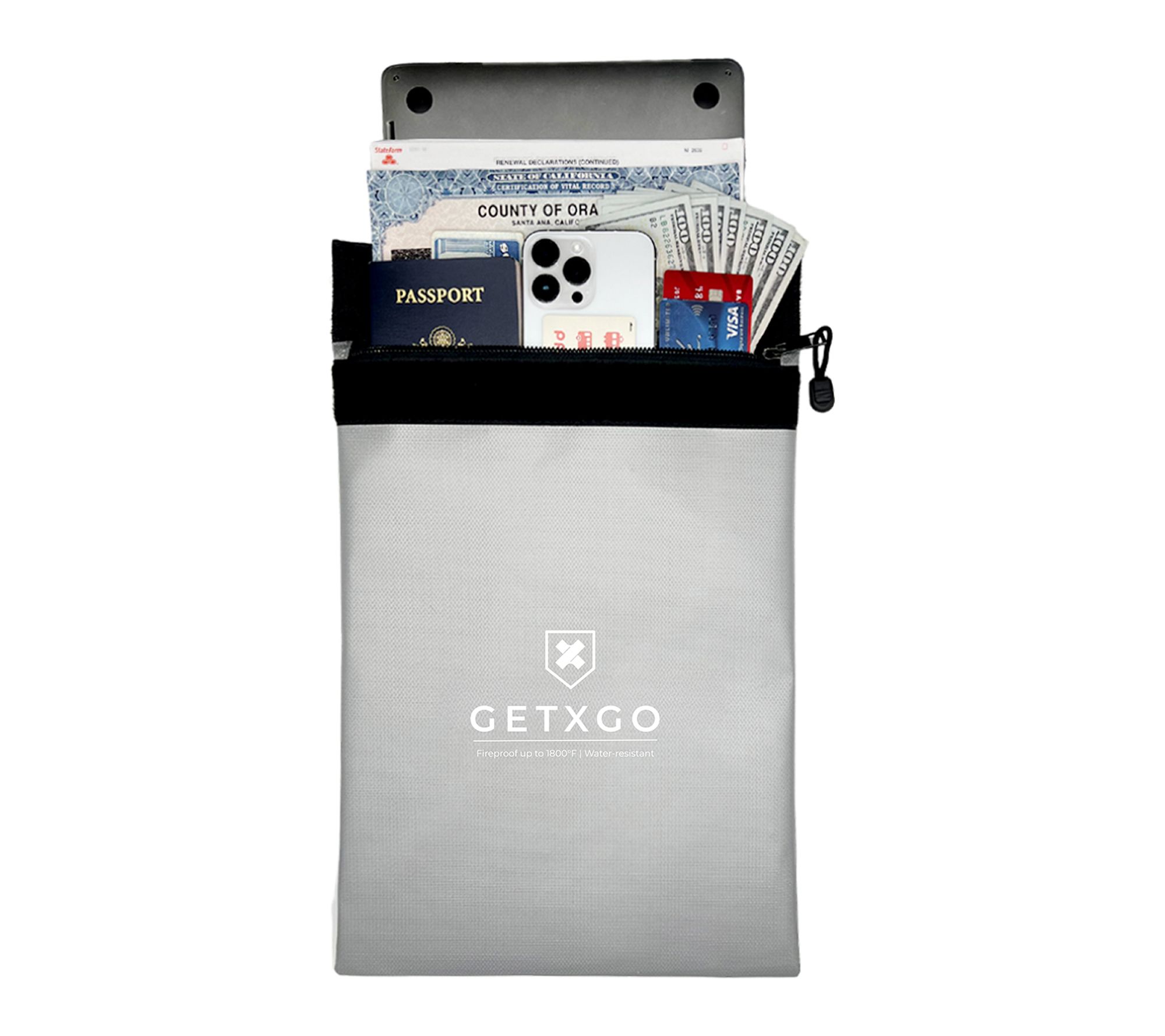 The GETXGO Document Bag is a portable protective bag for important documents and personal information-------- It features a zipper closure with fold-over flap for secure storage The interior holds papers, passports, notebooks, or a small laptop Lightweight and easy to carry in a tote or backpack. Made with silicone-coated fiberglass and aluminum interior lining. Measures 15L 11W and weighs approximately 0.44lbs. Made in China