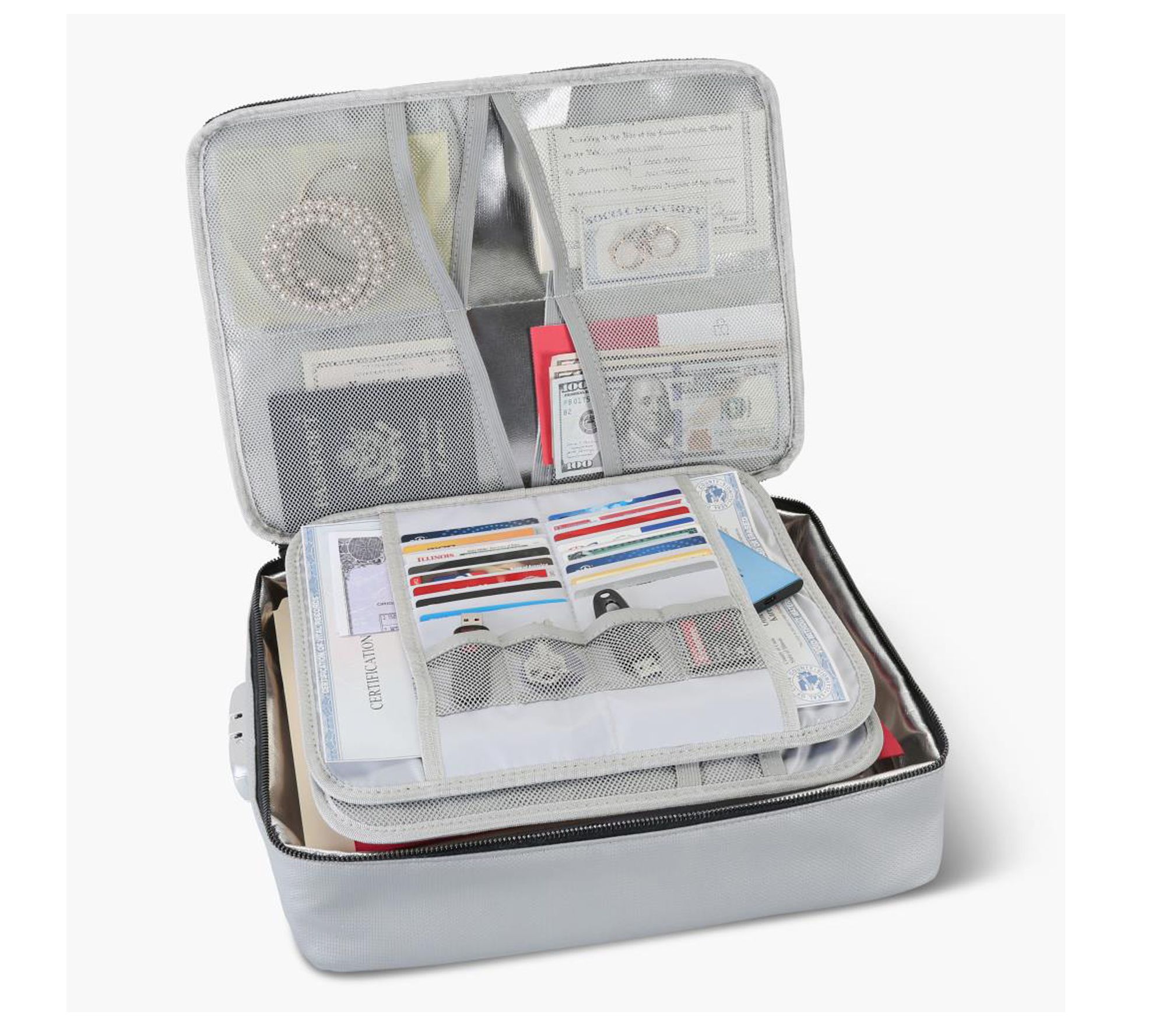 Whether you need to organize passports for your next trip or keep important papers safe, this portable document box keeps essentials neatly sorted and locked away. The structured, silicone-coated fiberglass exterior paired with aluminum lining offers secure and lightweight storage for cards, documents, and personal items -- making it an ideal solution for travel or home office organization. From GETXGO.