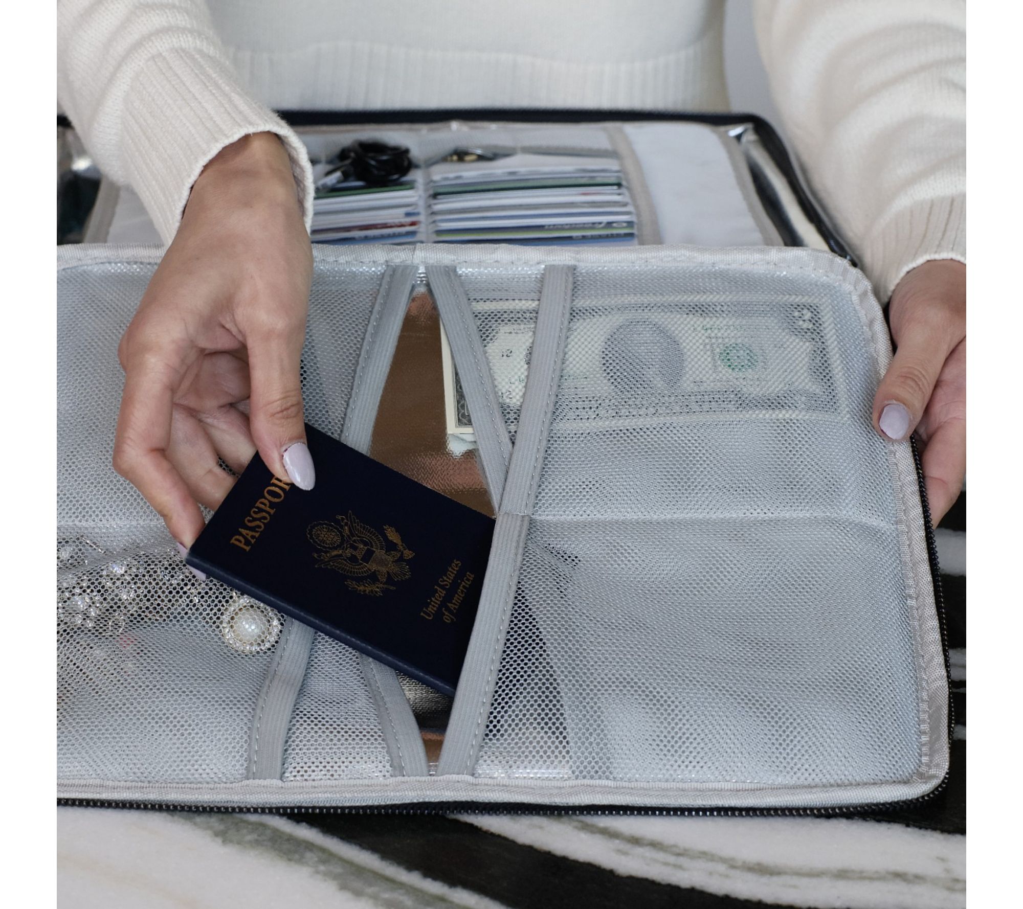 Five document pockets, eight passport pockets, 16 card pockets, and four USB drive pockets