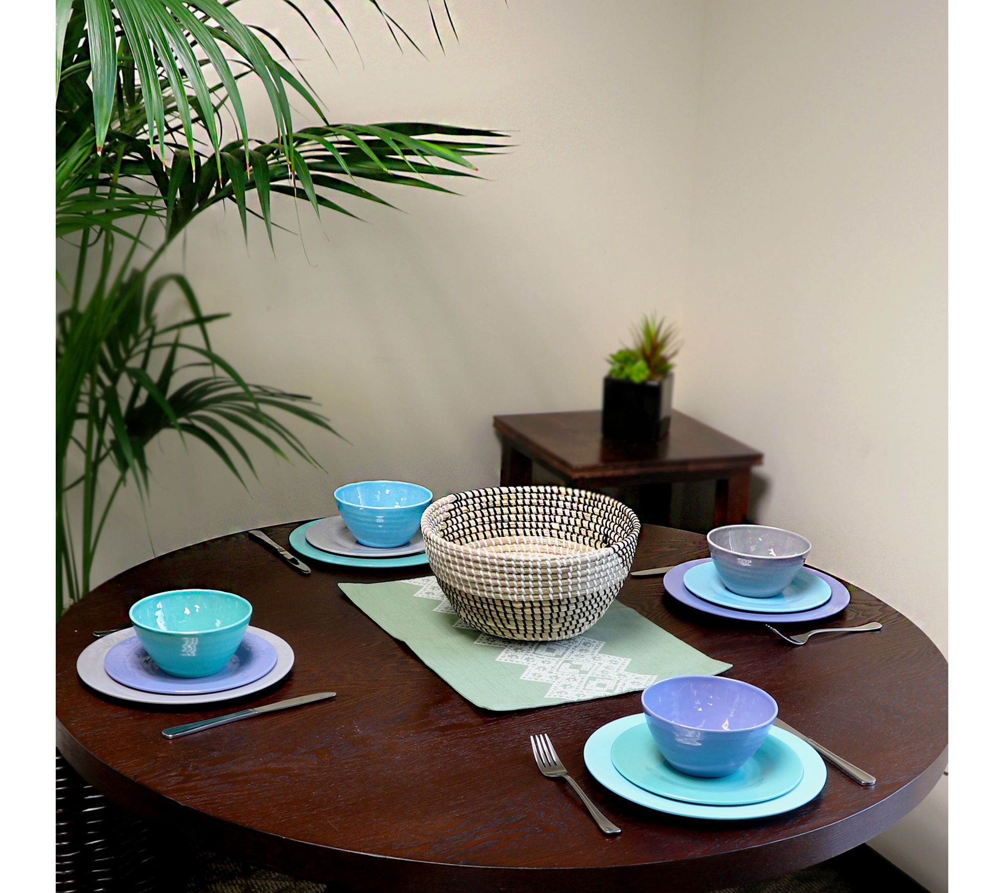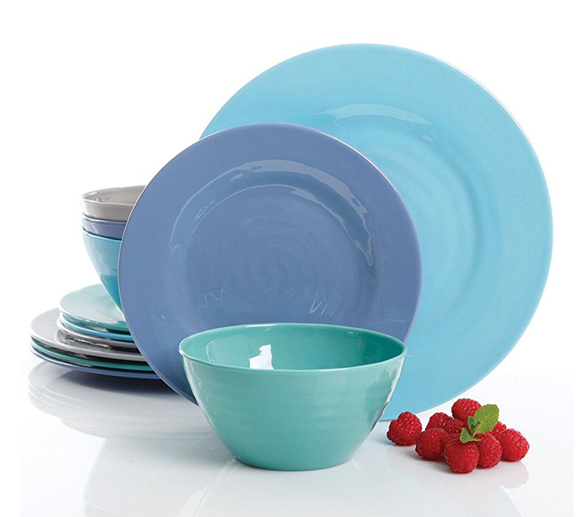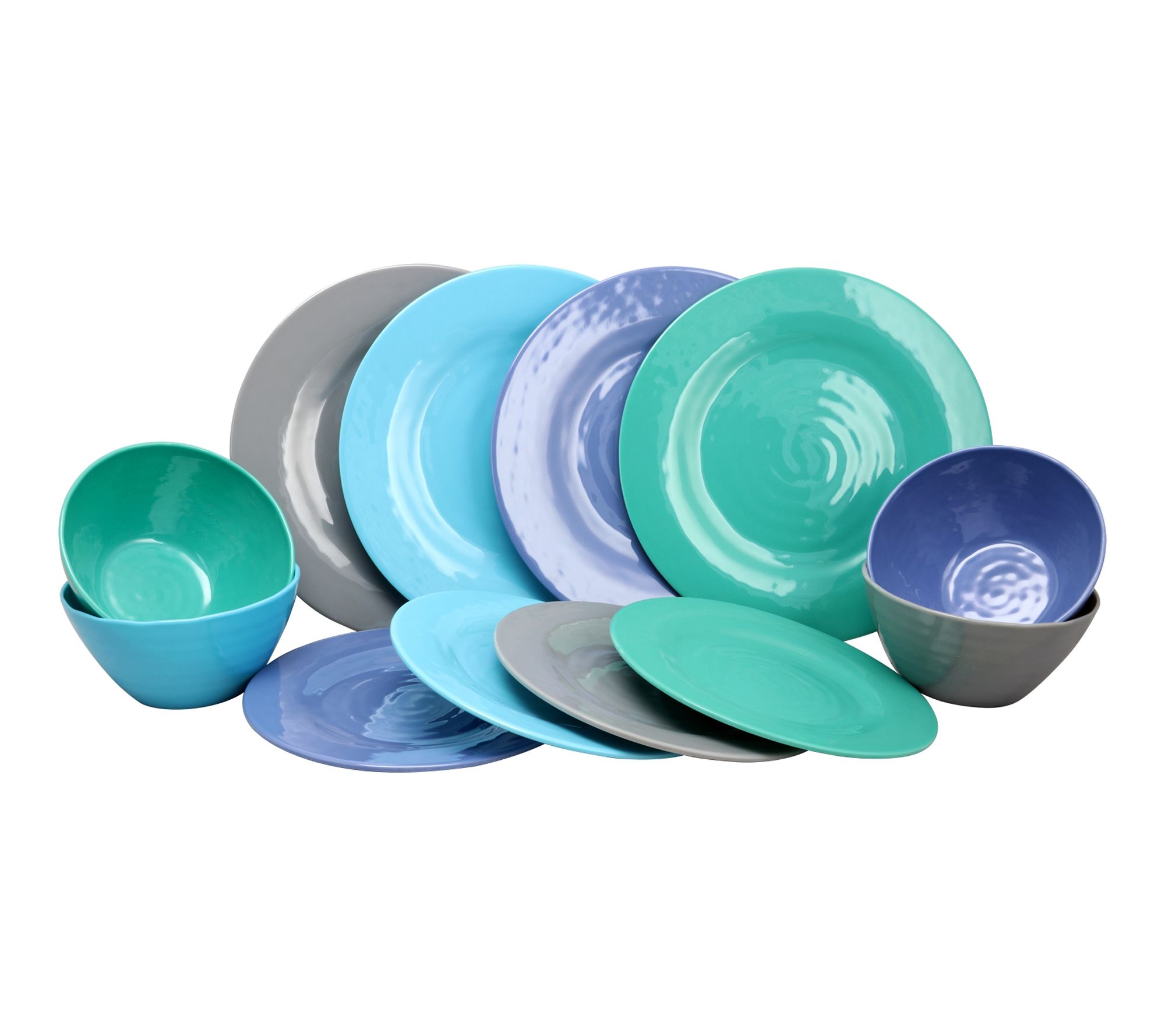 Add a splash of color to every meal with this 12-piece melamine dinnerware set, featuring vibrant shades of blue, gray, chameleon, and periwinkle blue. Chip-resistant and lightweight, these pieces are ideal for casual family dinners or outdoor gatherings like picnics and camping trips. From Gibson Home.