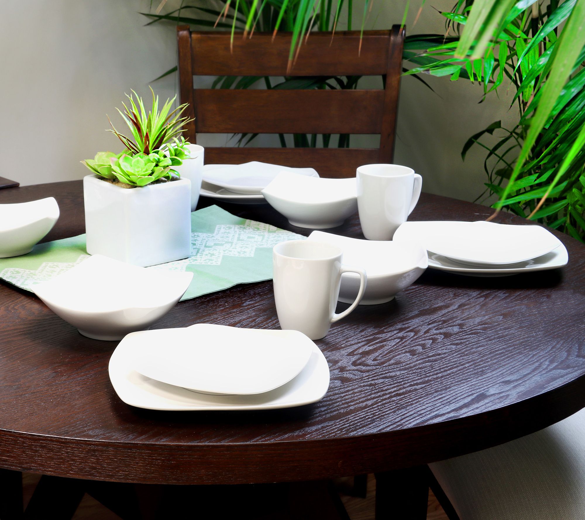 • Includes four dinner plates, four salad plates, four bowls, and four 12-oz mugs