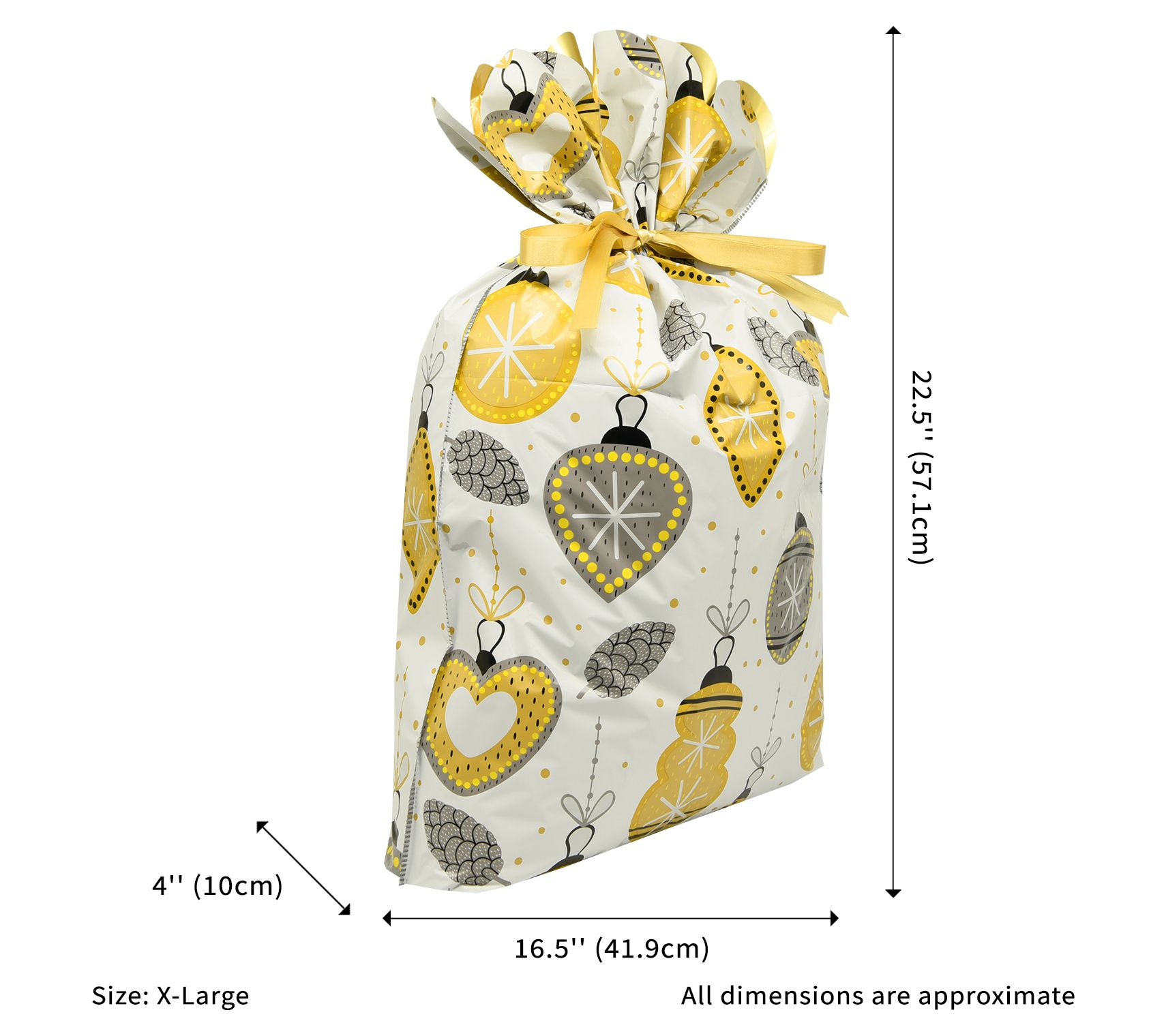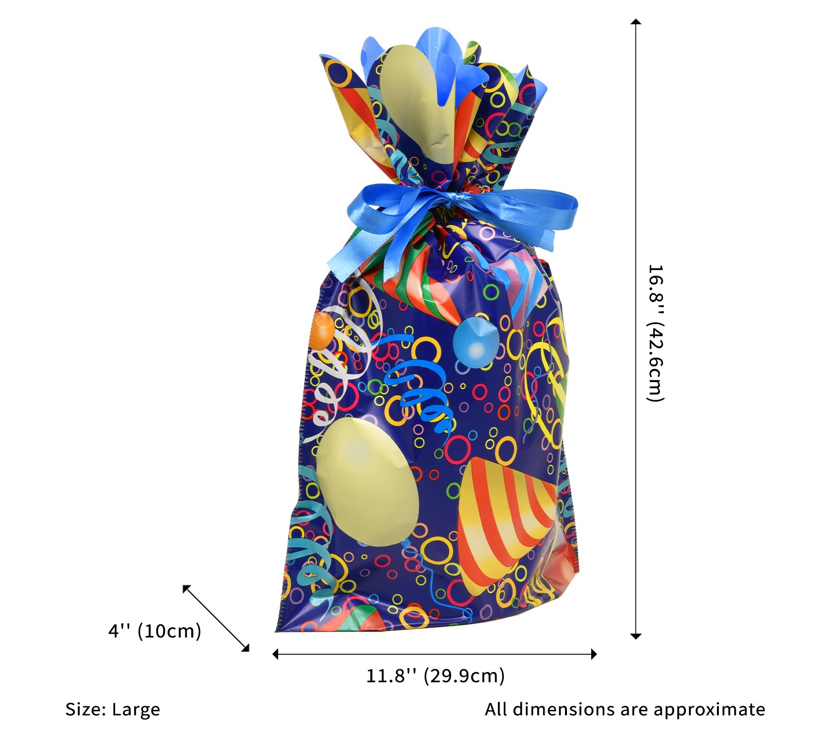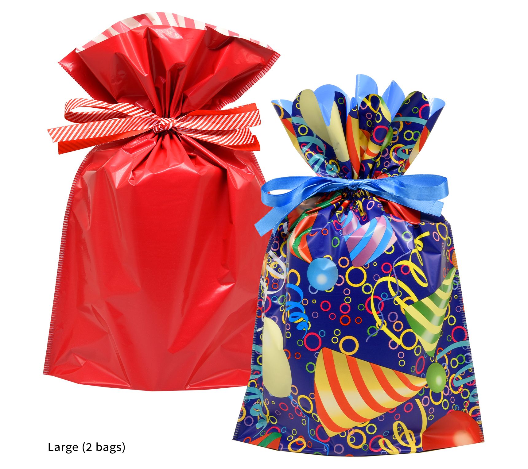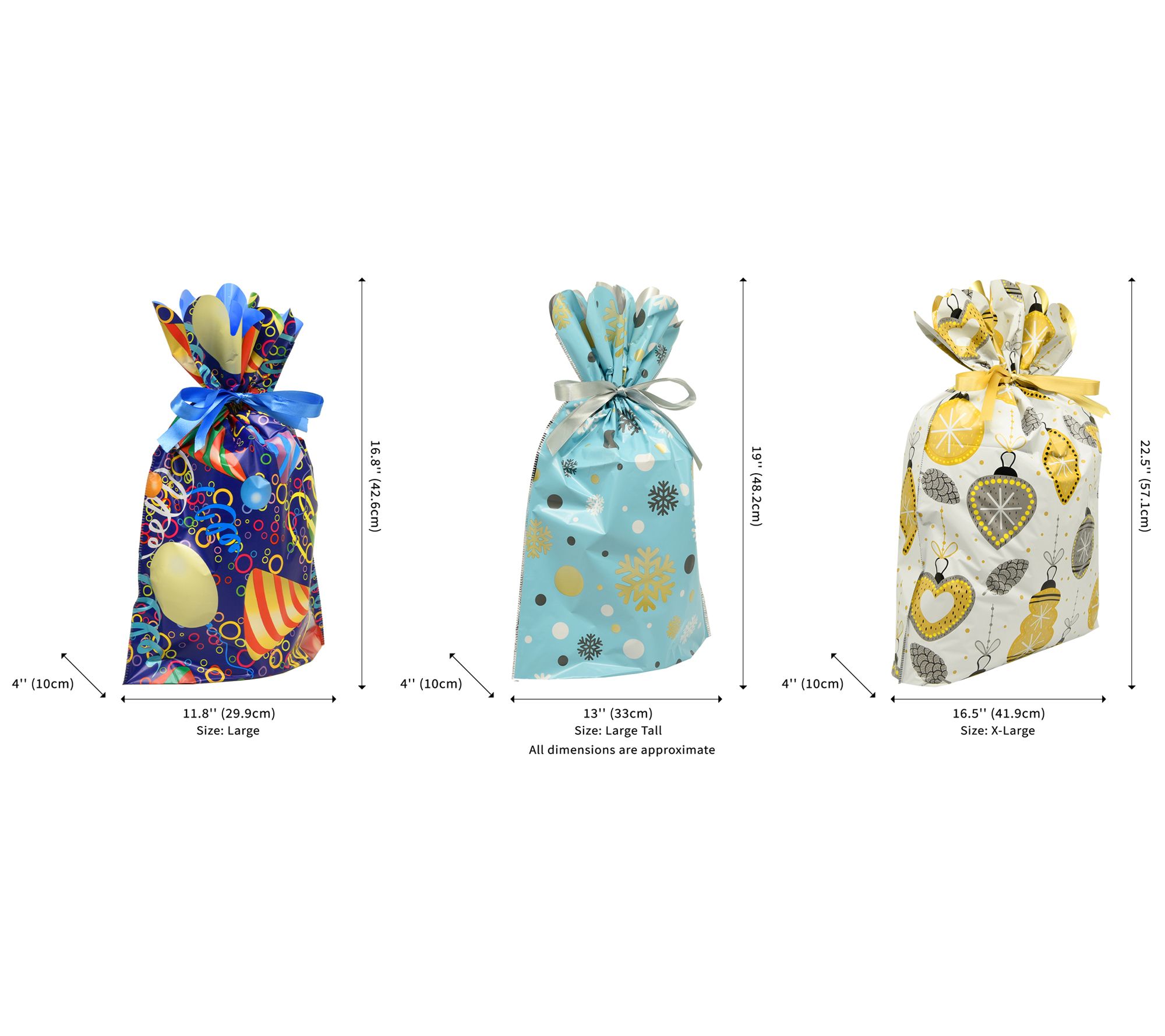 • Includes two extra-large drawstring gift bags, two tall large drawstring gift bags, two medium drawstring gift bags, and six gift tags