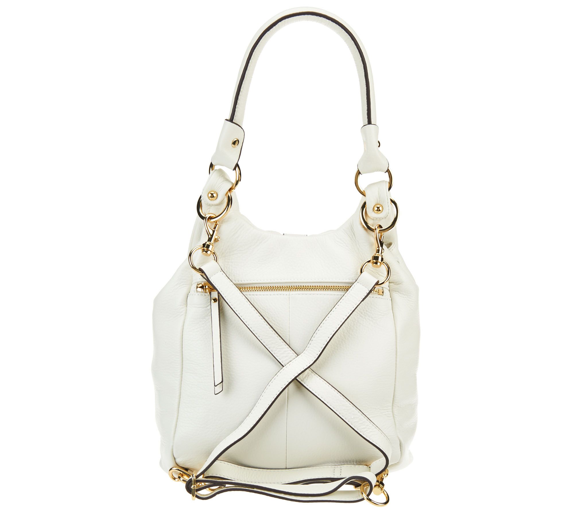 Hands-free has never been so high-end. Based on a popular silhouette, this convertible leather backpack from G.I.L.I. is the epitome of upscale adaptability. This luxe wonder easily adjusts to be worn as a backpack, shoulder bag, or crossbody bag. Talk about versatile! A roomy interior, shiny goldtone hardware, and tantalizing leather texture add to its irresistible appeal.