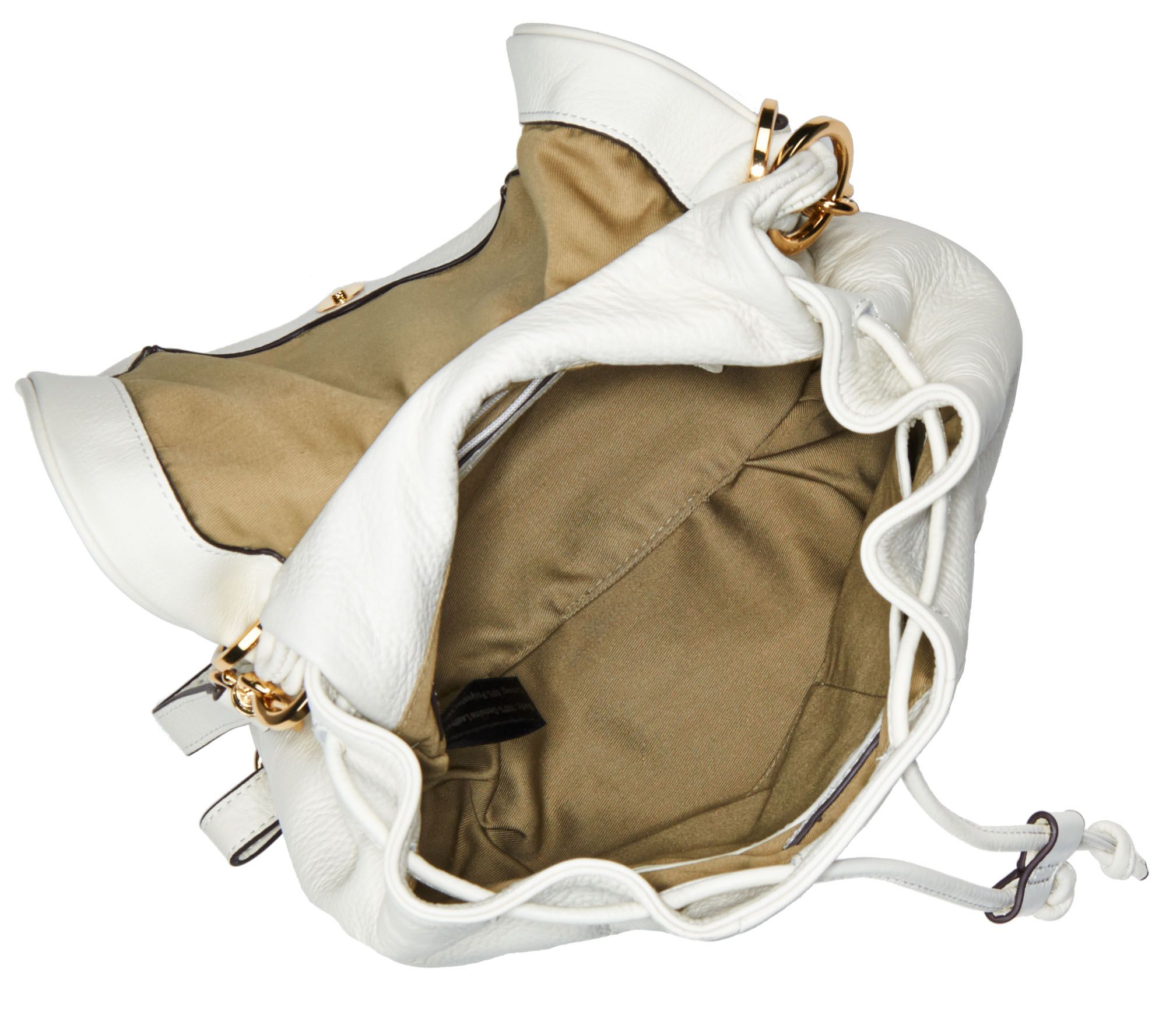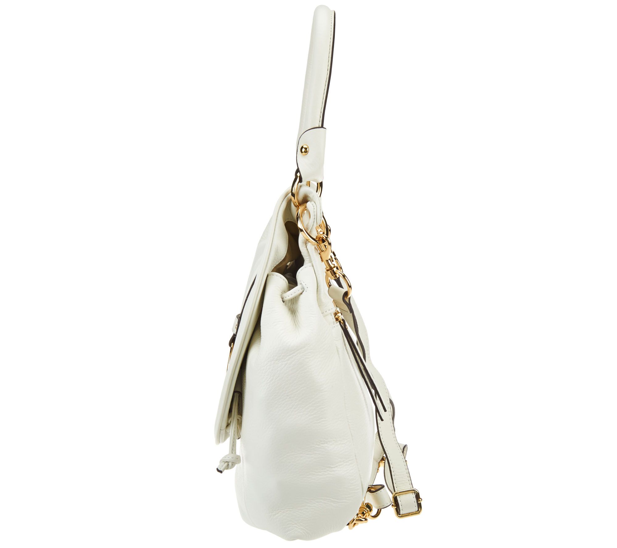 Top handle, removable backpack straps, snap and drawstring closures, buckle detail, back zip pocket, shiny goldtone hardware, tassel