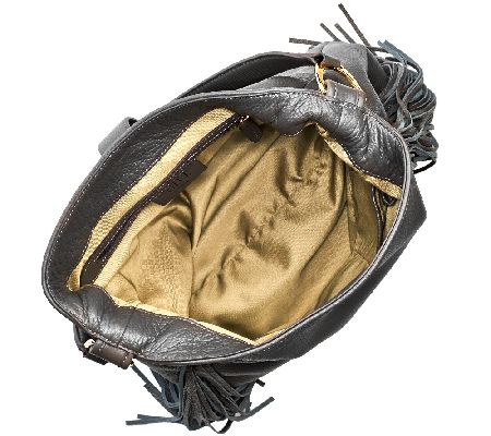 Fringe detail, goldtone hardware, top strap, stirrup magnetic closure, signature removable tassel, back slip pocket with snap closure