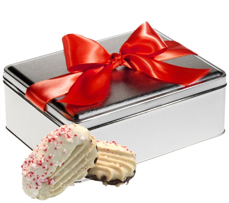 • Includes 12 1.7-oz white chocolate peppermint cookies in gift tin with ribbon