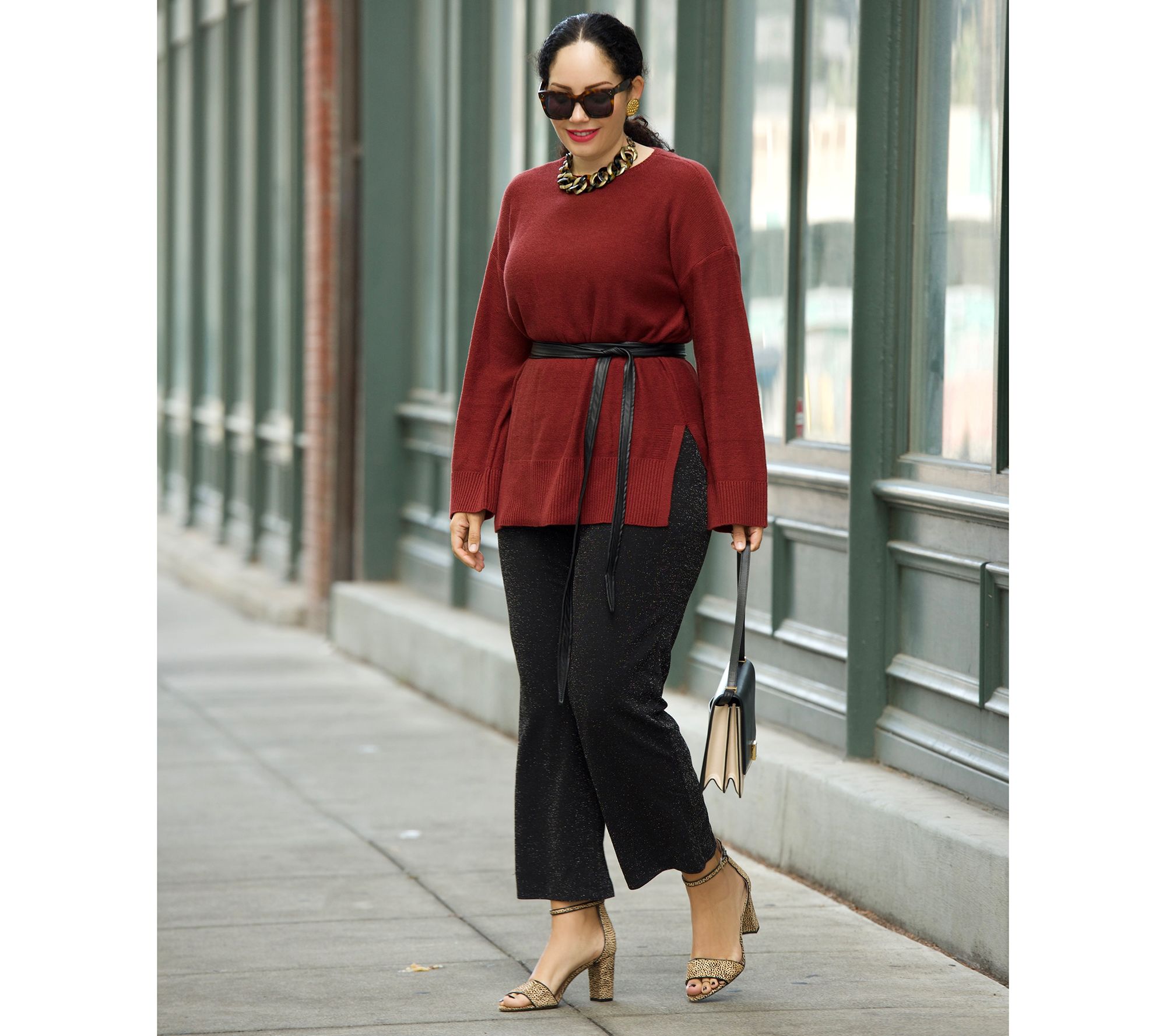 Add some funk to your everyday fashion rotation with these glitter-knit pants. Match them with your favorite cardigans and blouses to make a statement in the office. From Girl with Curves.