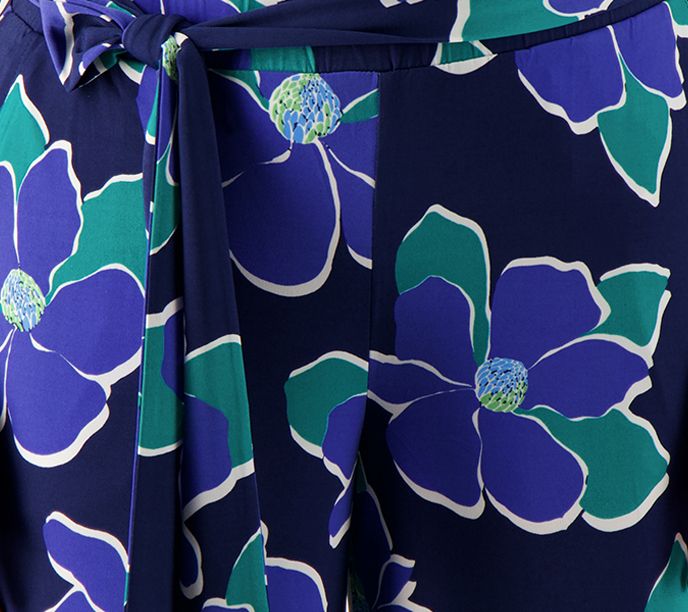 Features: encased elastic waistband, front slash pockets, self belt with thread loops