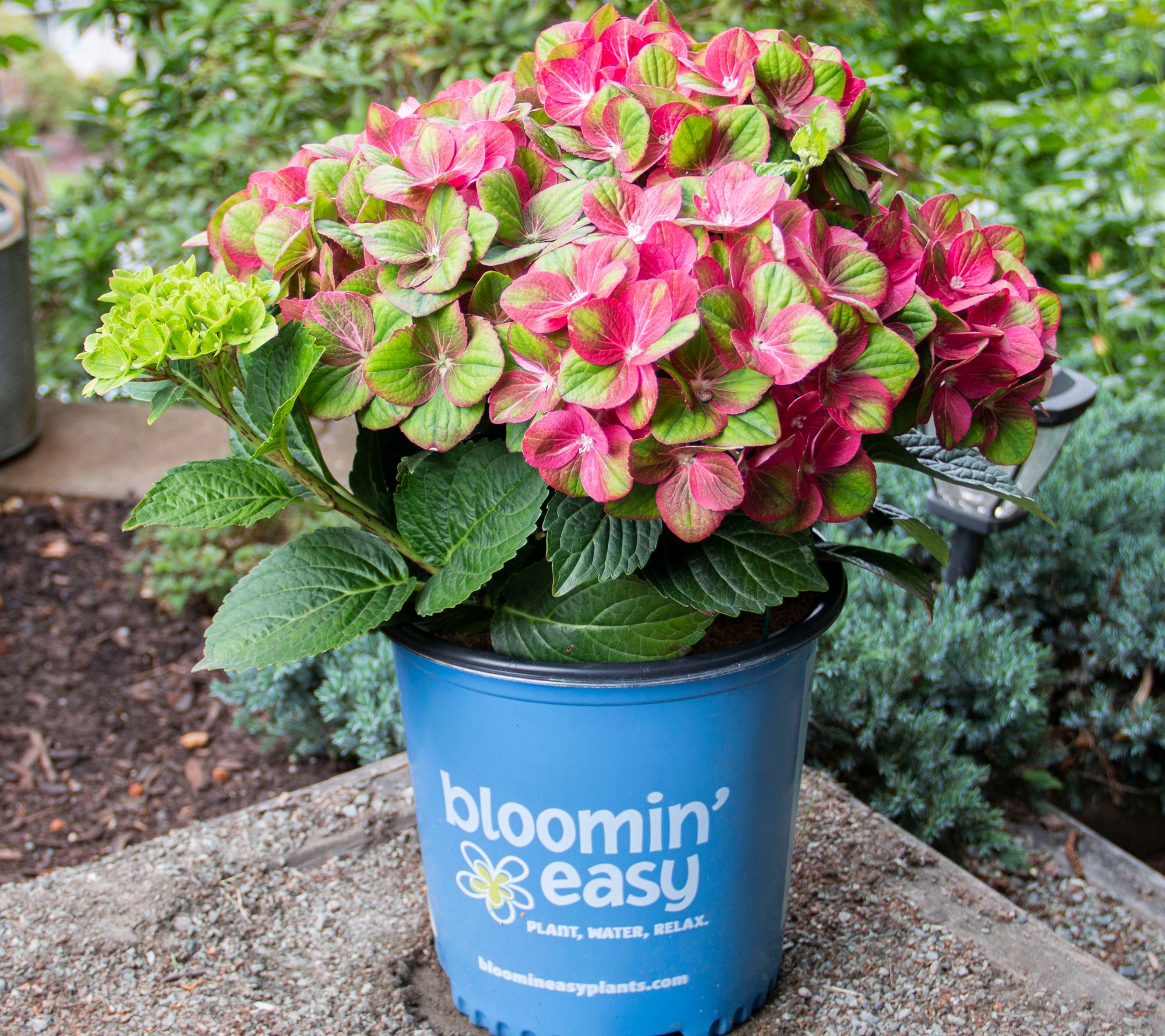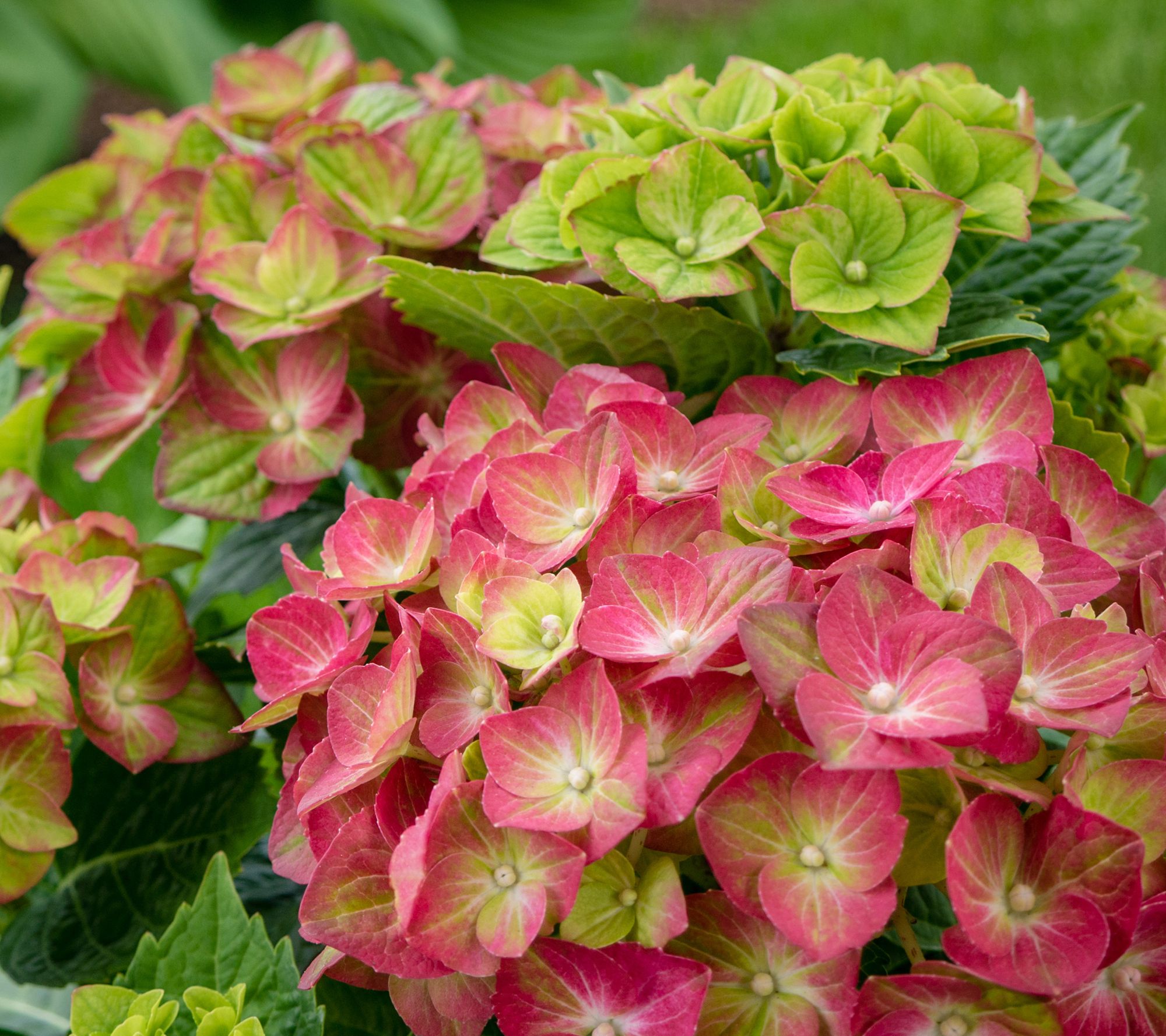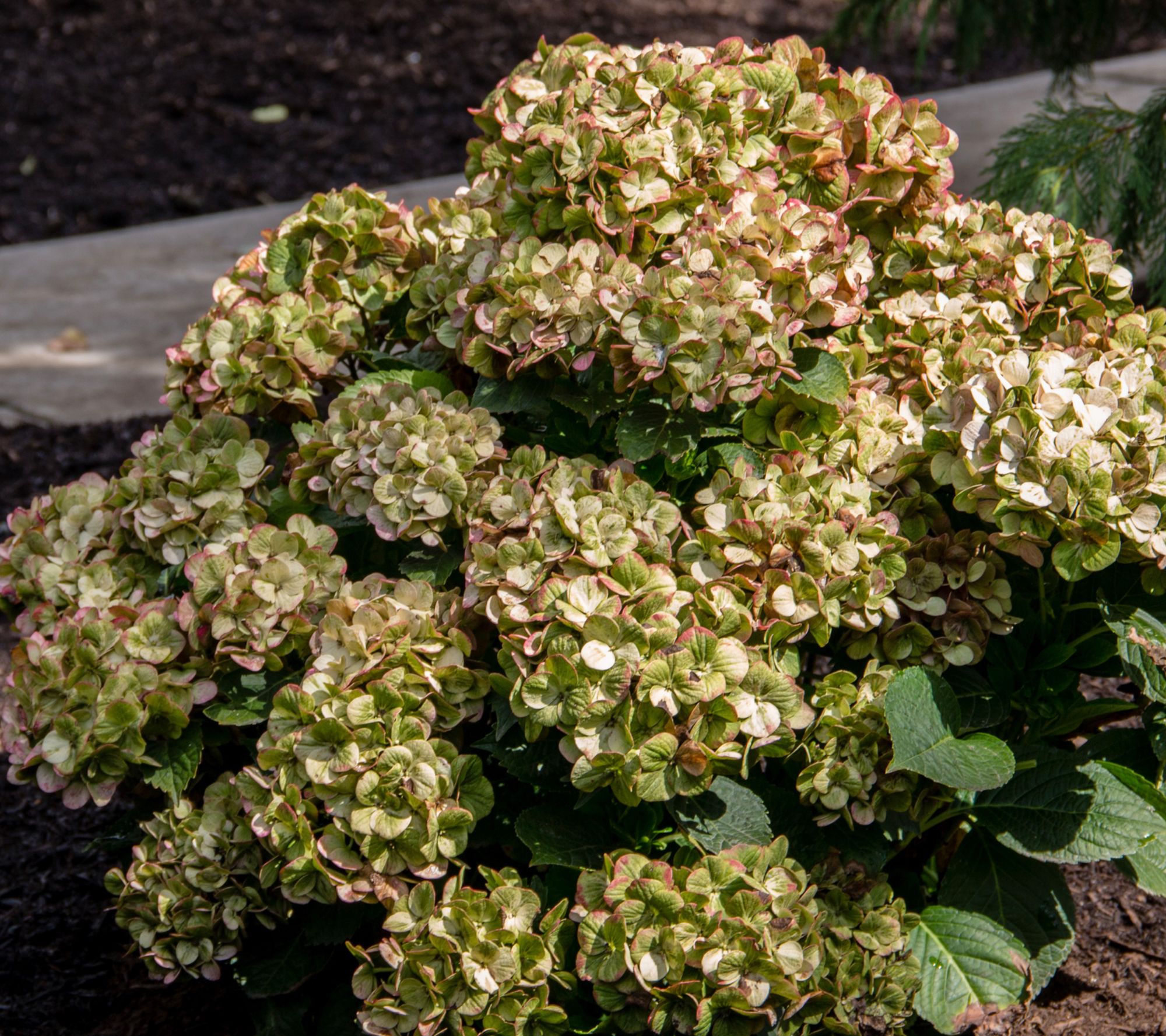 Brighten your garden with the captivating charm of the Tilt-A-Swirl hydrangea. Watch as the large mophead flowers morph from a red and green bi-color tone to a deepening red with swirls of green throughout the summer. Perfect for planting along walkways, under trees, or as a foundation plant, this delightful perennial is both easy to grow and winter hardy. From Girl Next Door.