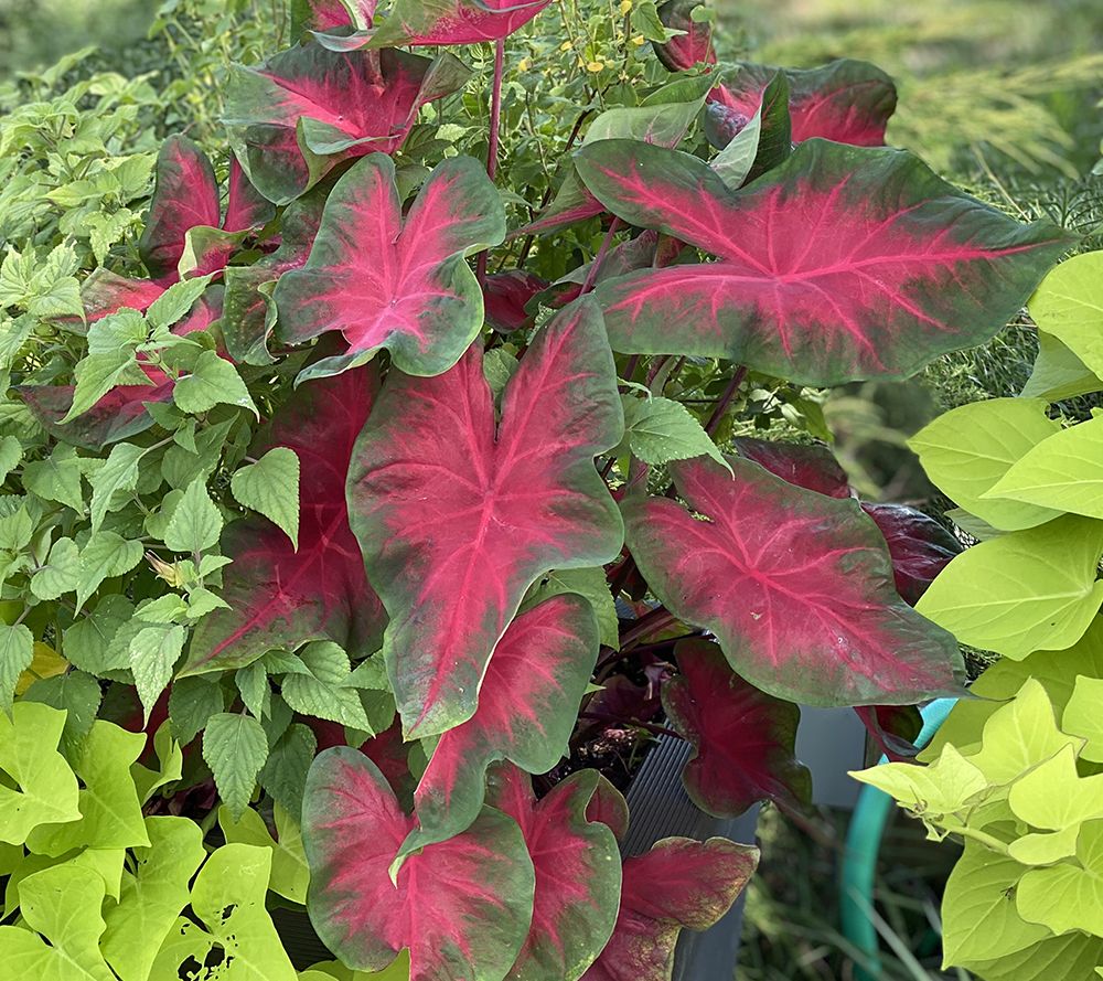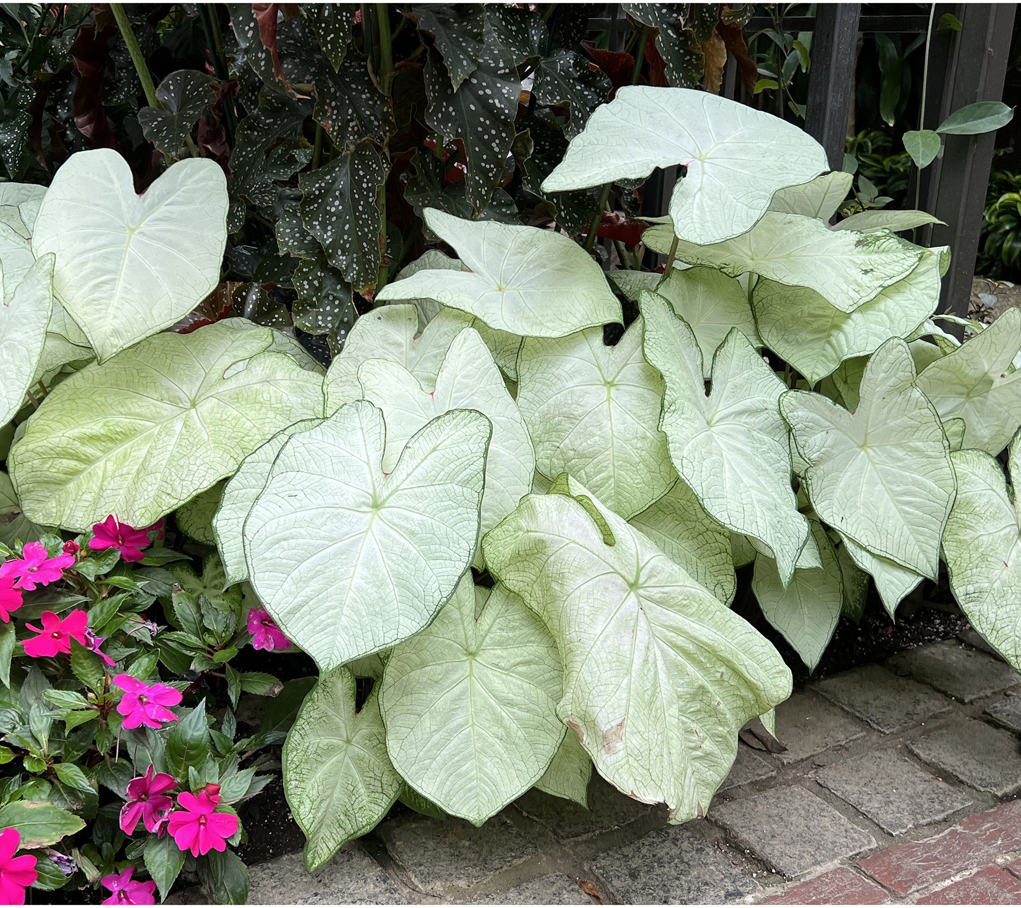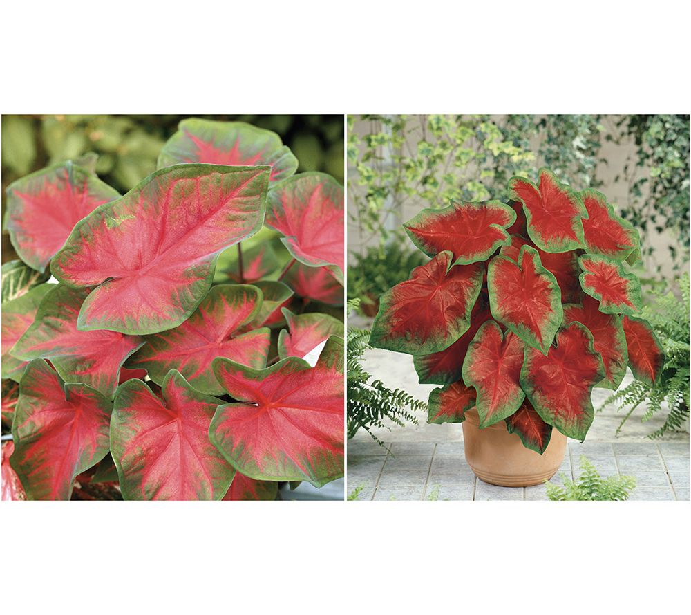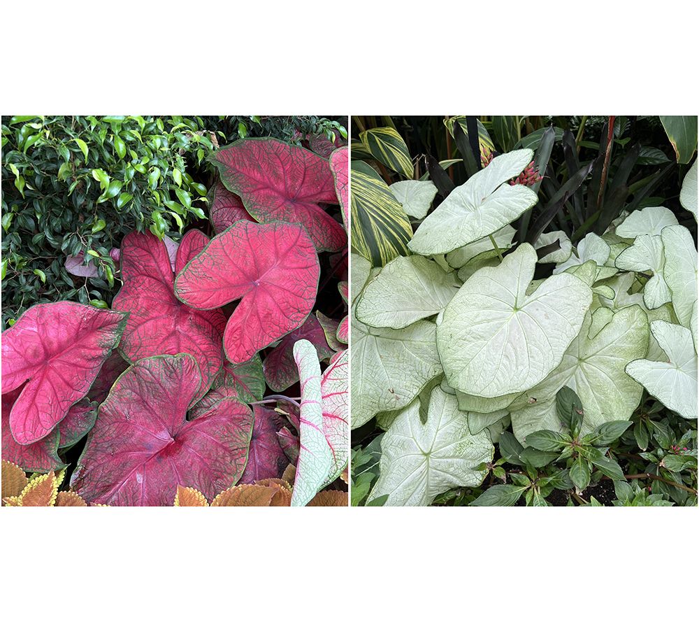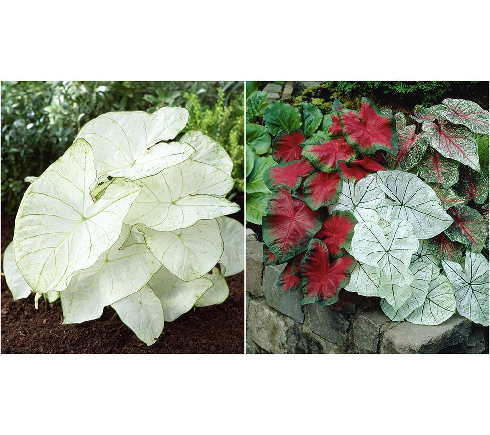 Transform your garden or patio with the vibrant colors of this captivating Caladium collection. Enjoy the deep, lush green edges and bright red veins of the Royal Flush, contrasted with the Moonlight variety's white leaves and striking green veins. Thriving in both sun and shade, these easy-growing beauties will enhance your outdoor space in no time and are perfect for beds, borders, window boxes, or patio containers. Consider overwintering them indoors to enjoy their foliage year-round. From Roberta's.