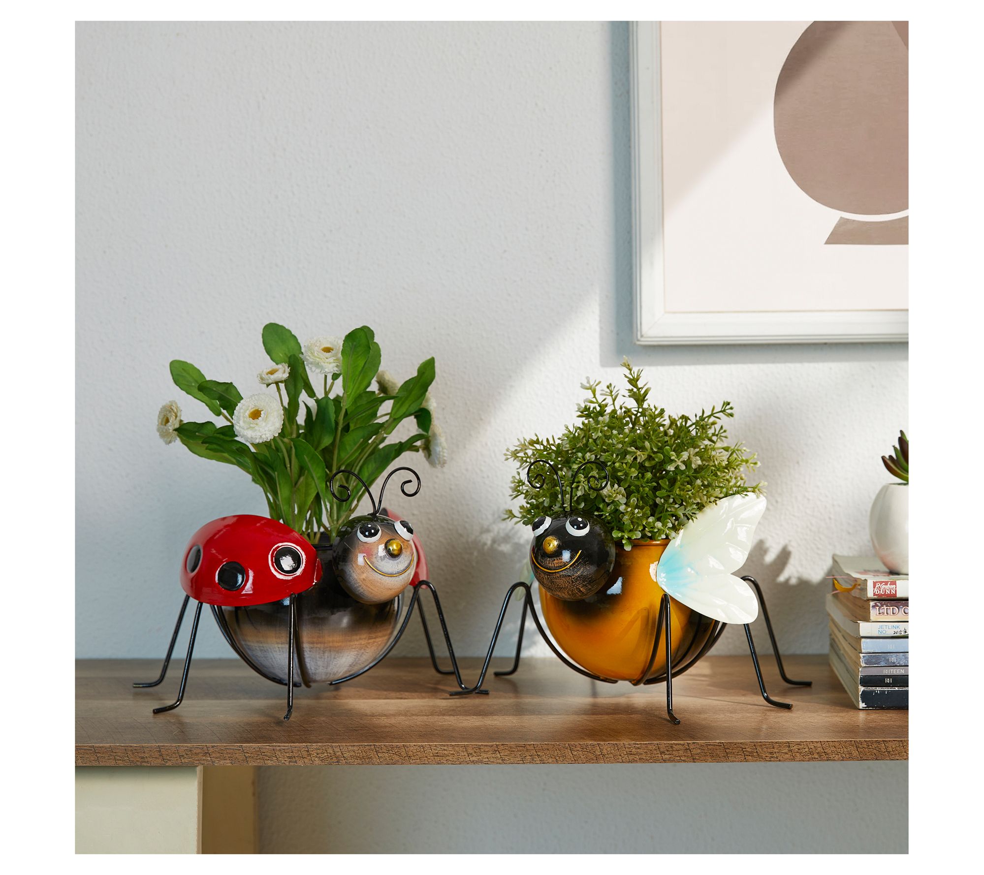 Add a touch of whimsy to your garden or patio with this delightful set of two metal bee and ladybug planters. Crafted for both style and functionality, these planters feature vibrant painted details and are perfect for showcasing your favorite greenery. Designed with drainage holes, these planters ensure your plants stay healthy and happy. From Glitzhome.