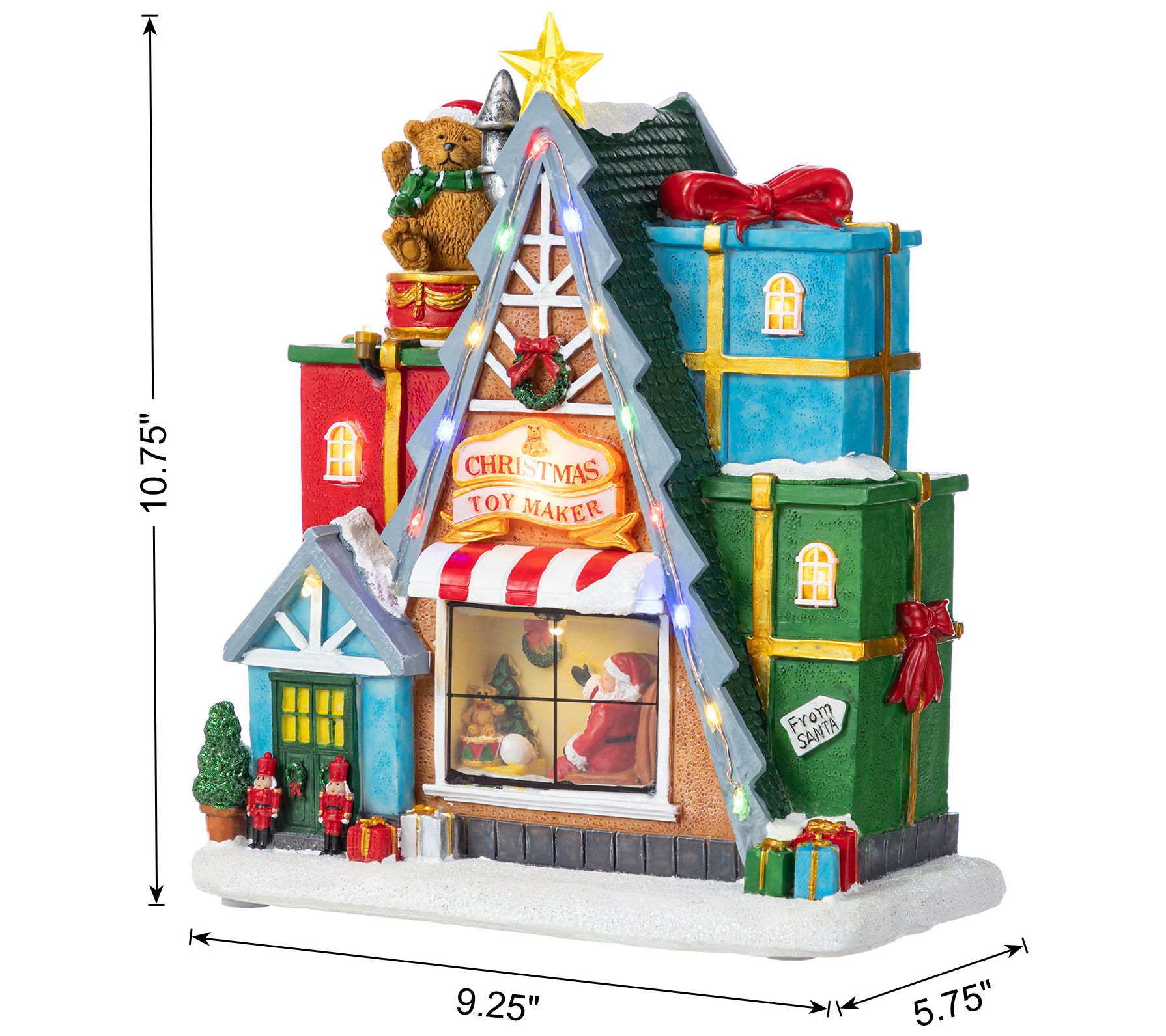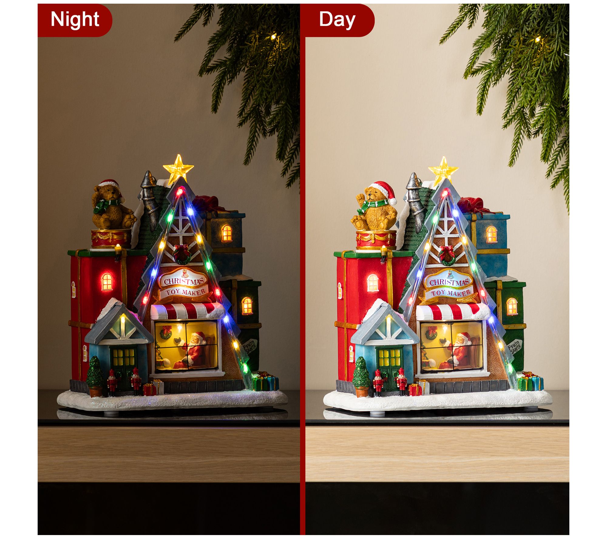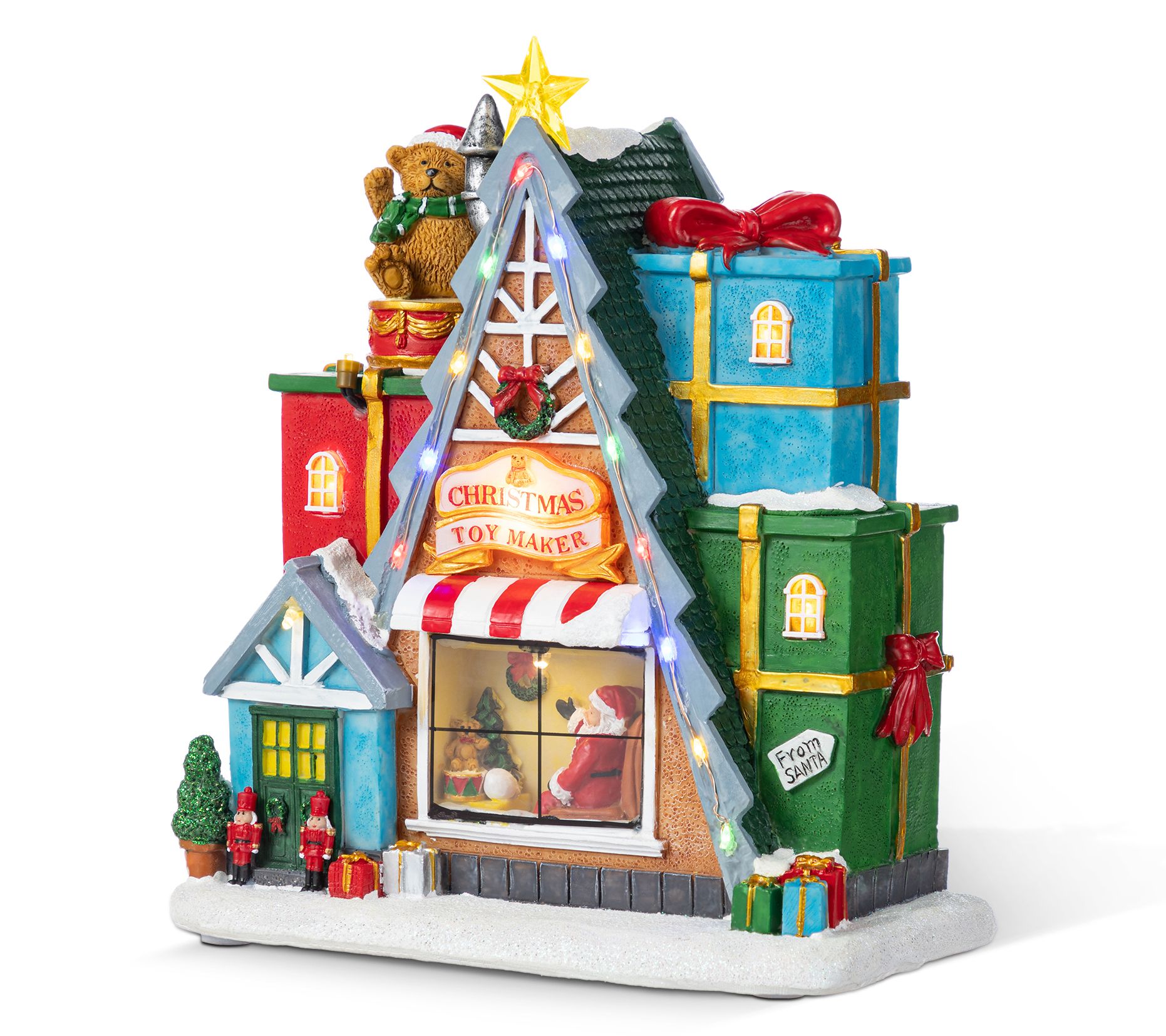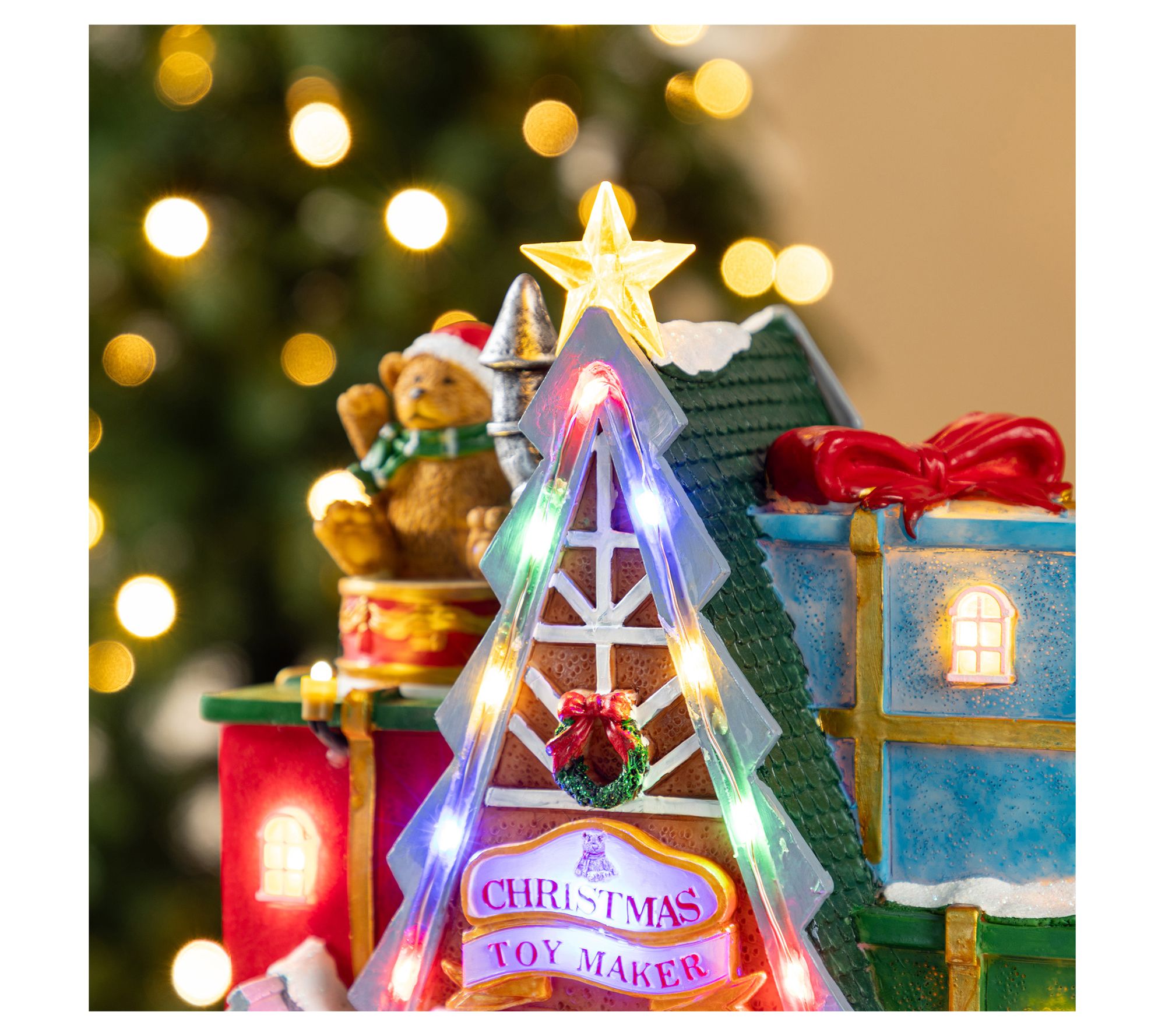 Create a cozy holiday atmosphere with this enchanting lighted village piece. The charming Christmas toy market scene, crowned with a playful rotating bear, is perfect for adding a dash of whimsy to your living space. Vibrant multi-colored lights and delightful tunes of classic holiday songs bring festive cheer, making it an instant conversation starter. From Glitzhome.
