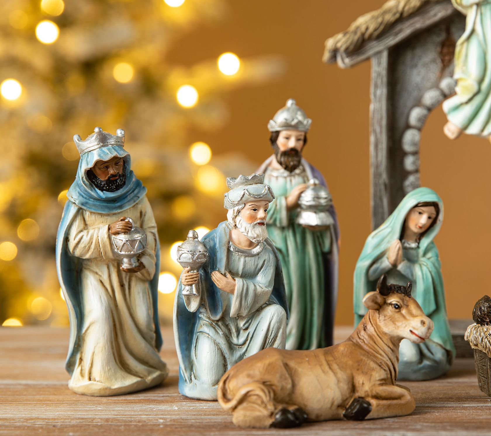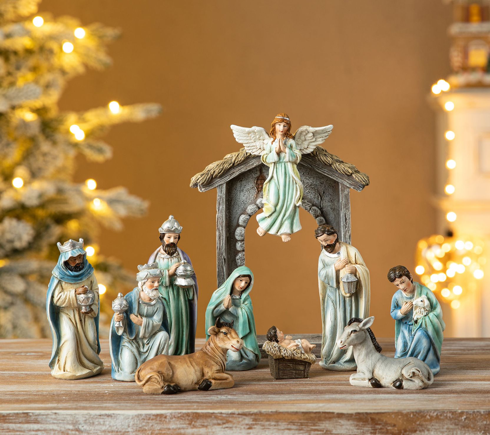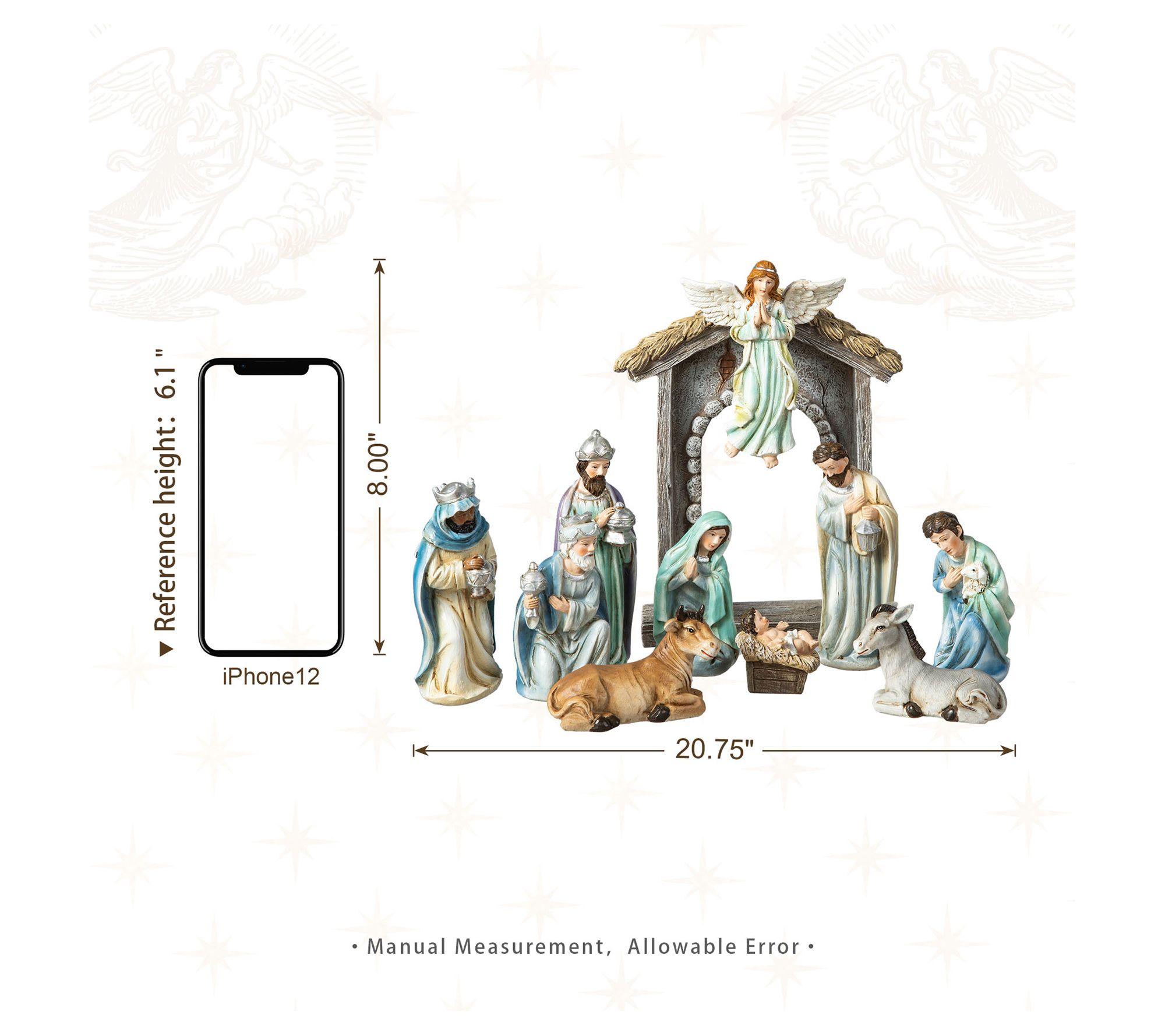 • Includes 11 figurines: the Holy Family, three Wise Men, a shepherd, an angel (removable from the arch), a cow, and a donkey